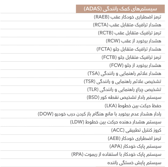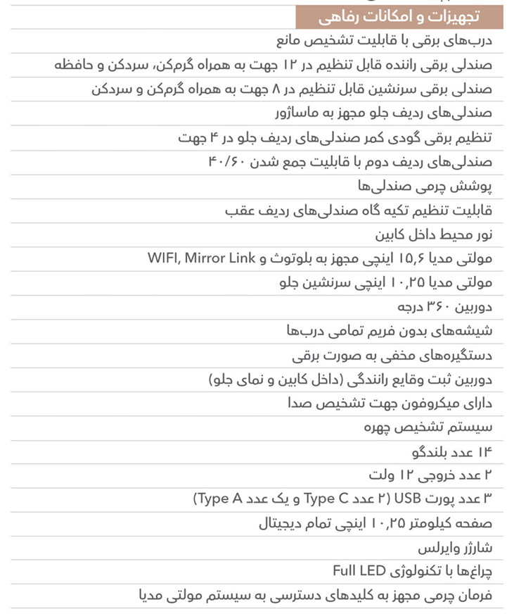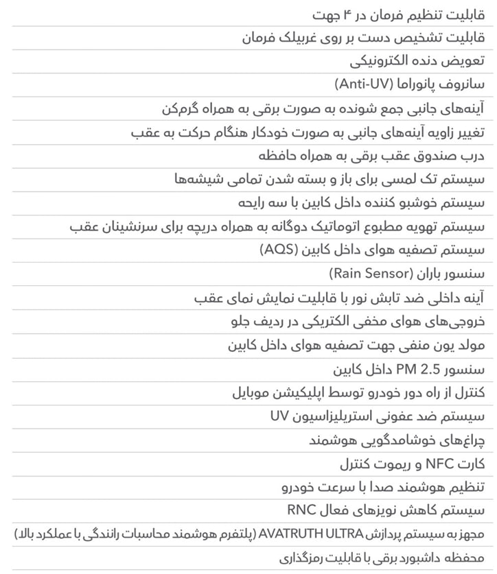 | آپشنها | سقف پانوراما، سیستم مالتیمدیا | کروز کنترل تطبیقی، سیستمهای کمکی رانندگی | سقف پانوراما، سیستمهای هوشمند | سیستم رانندگی خودکار، صفحه نمایش بزرگ |