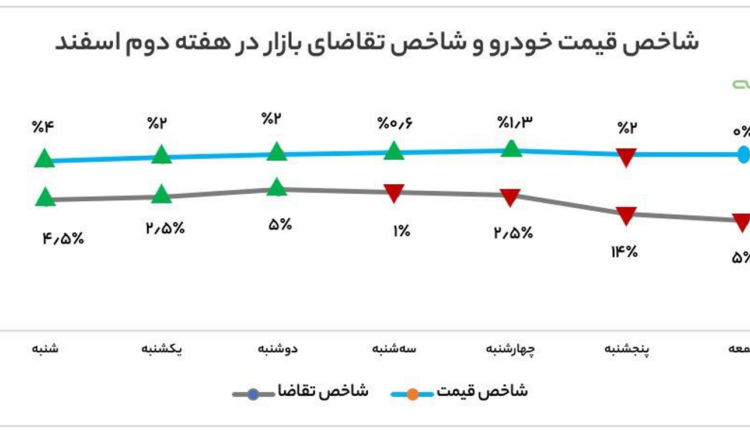 براساس آنچه در نمودار بالا پیداست، بعد از انتشار اخبار تکمیلی درباره عرضهی بدون قرعهکشی ۵۰۰ هزار خودرو در هفته گذشته، شاخص تقاضای بازار افت پیدا کرد. علیرغم کند شدن شیب رشد قیمت در نیمه دوم هفته گذشته، بازار خودرو رونق نگرفت و میزان تقاضا برای خرید خودرو در بازار آزاد، با شیب تندی کاهش یافت.