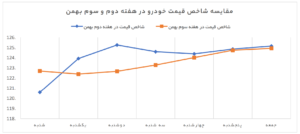 هفته سوم بهمنماه در حالی آغاز شد که شاخص قیمت خودرو بعد از پایان تعطیلات، ۲.۵ درصد نسبت به آخرین روز هفته قبل کاهش یافت. همانطور که در نمودار پیداست شاخص کل قیمت در هفته سوم بهمن کاهش قابل توجهی پیدا کرد، از روز سهشنبه رو به افزایش رفت و تا پایان هفته، به عدد شاخص کل در مشابه هفته قبل نزدیک شد.