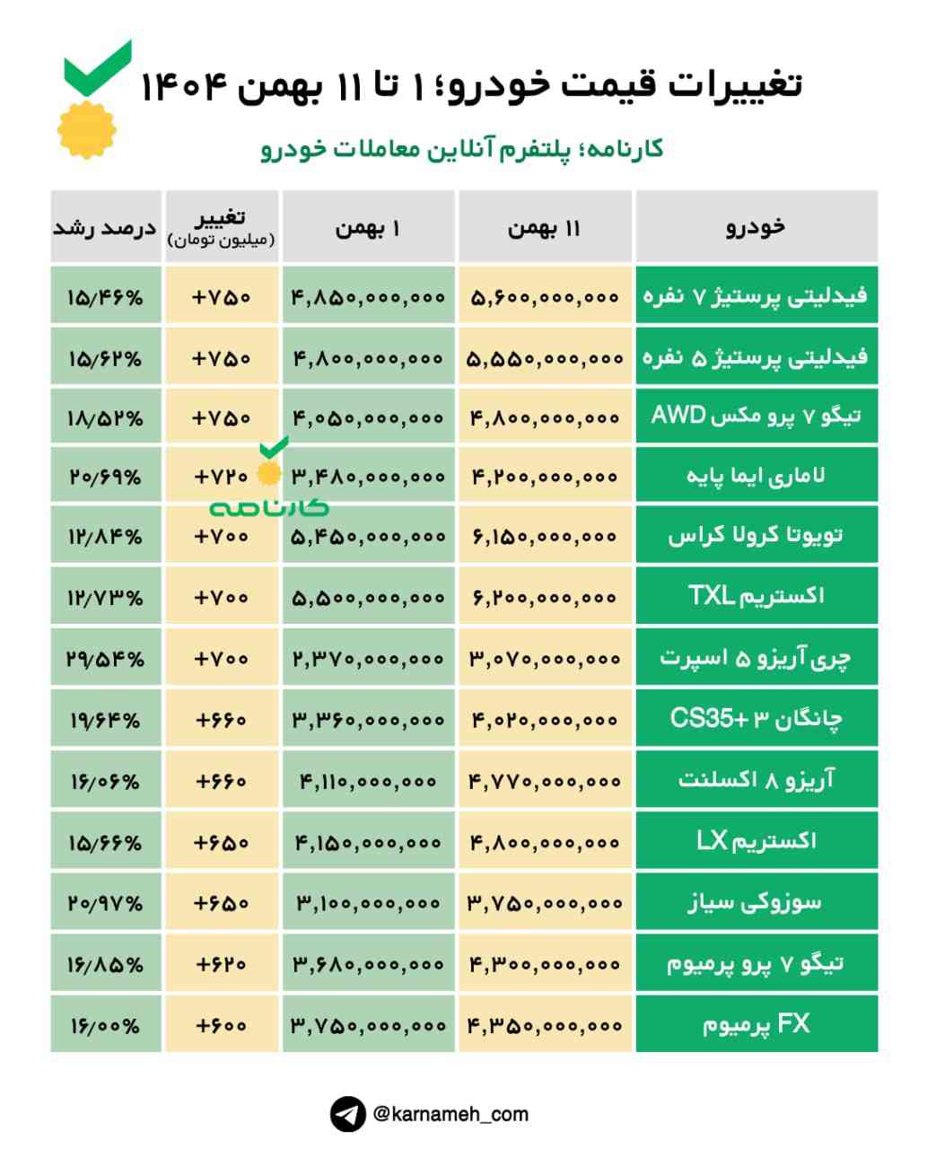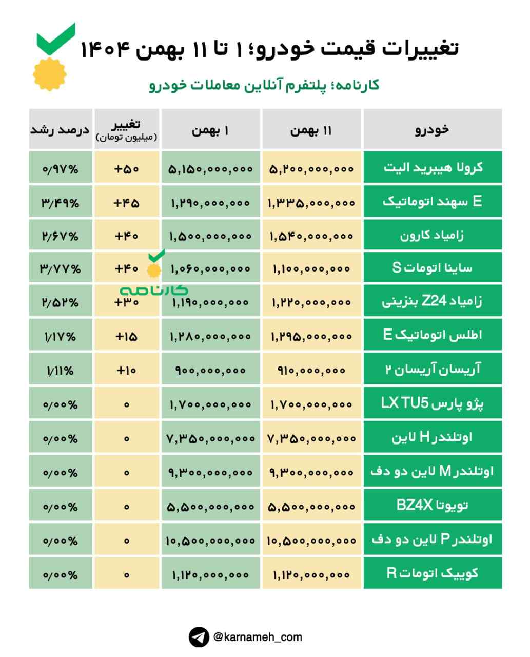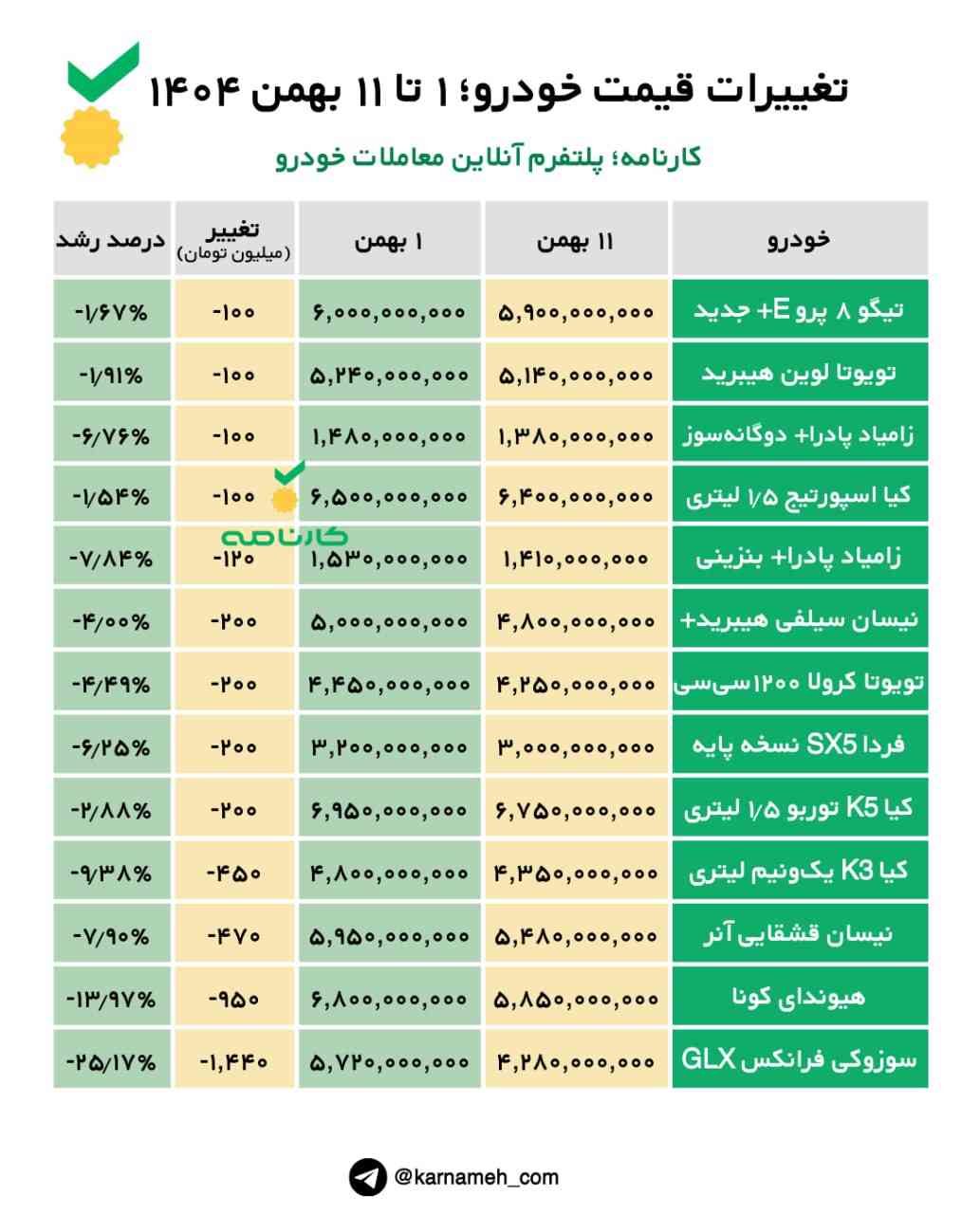 تغییرات قیمت خودرو؛ ۱ تا ۱۱ بهمن ۱۴۰۴