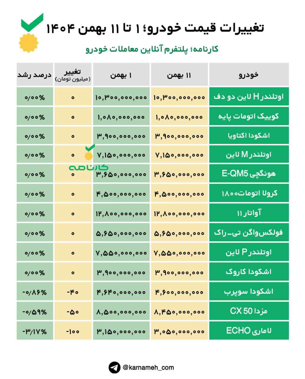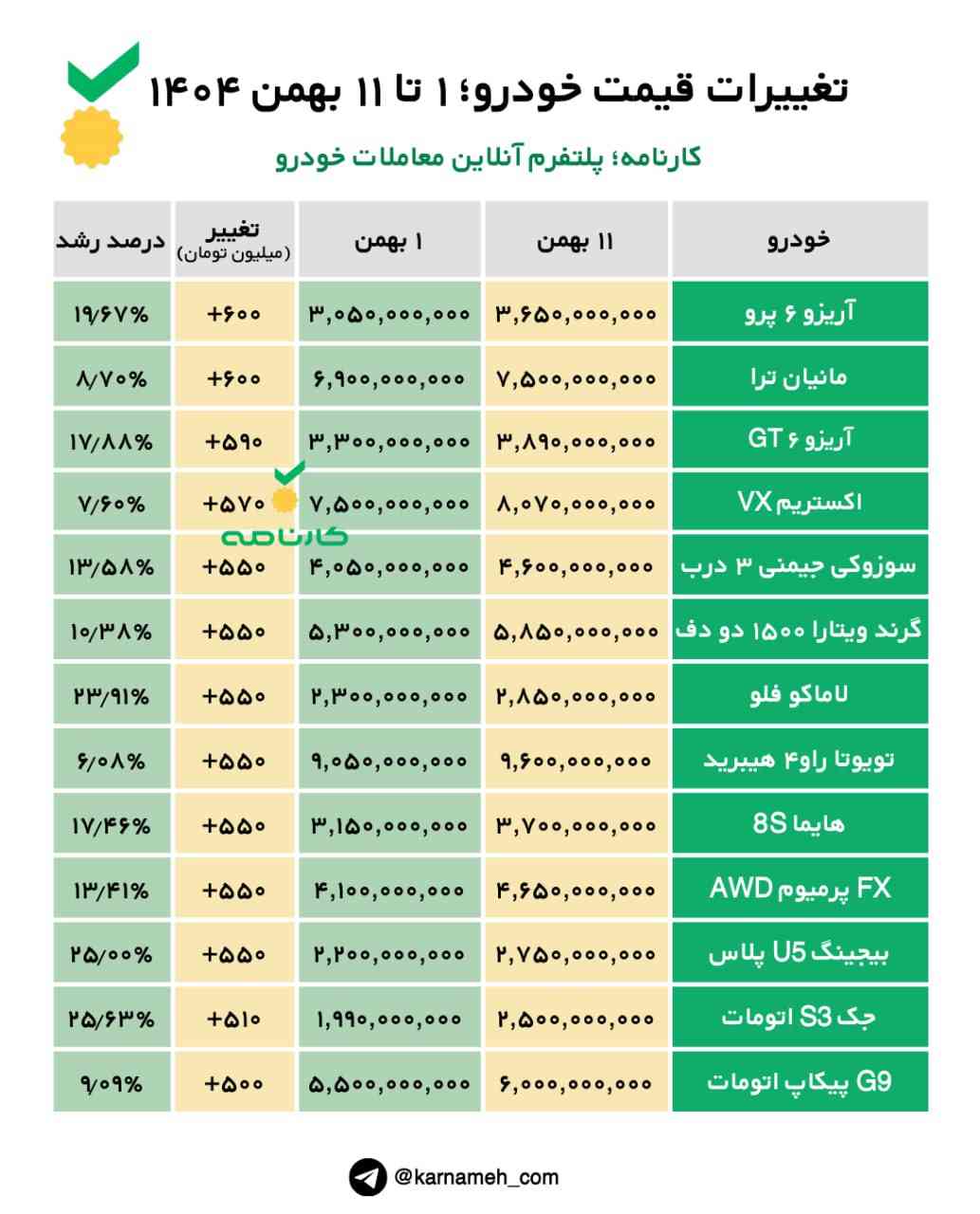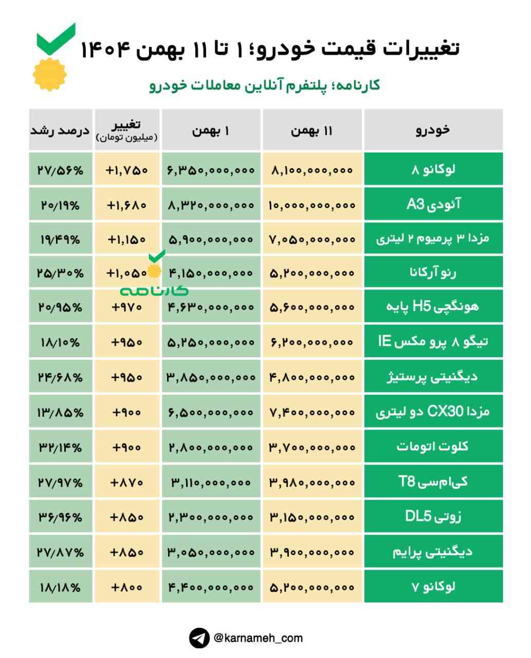 تغییرات قیمت خودرو؛ ۱ تا ۱۱ بهمن ۱۴۰۴
