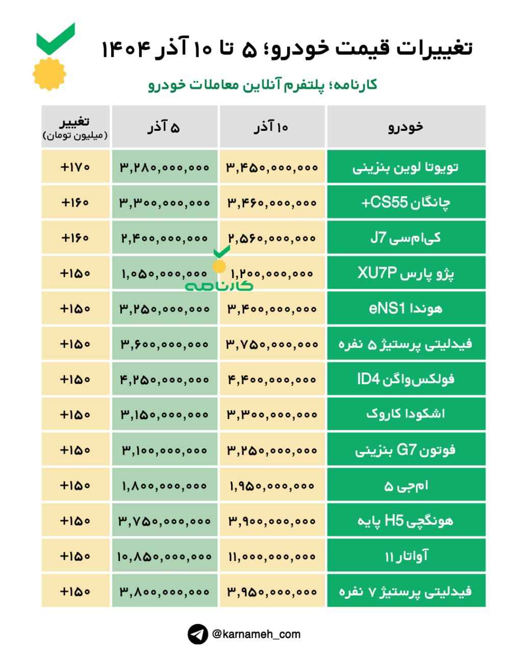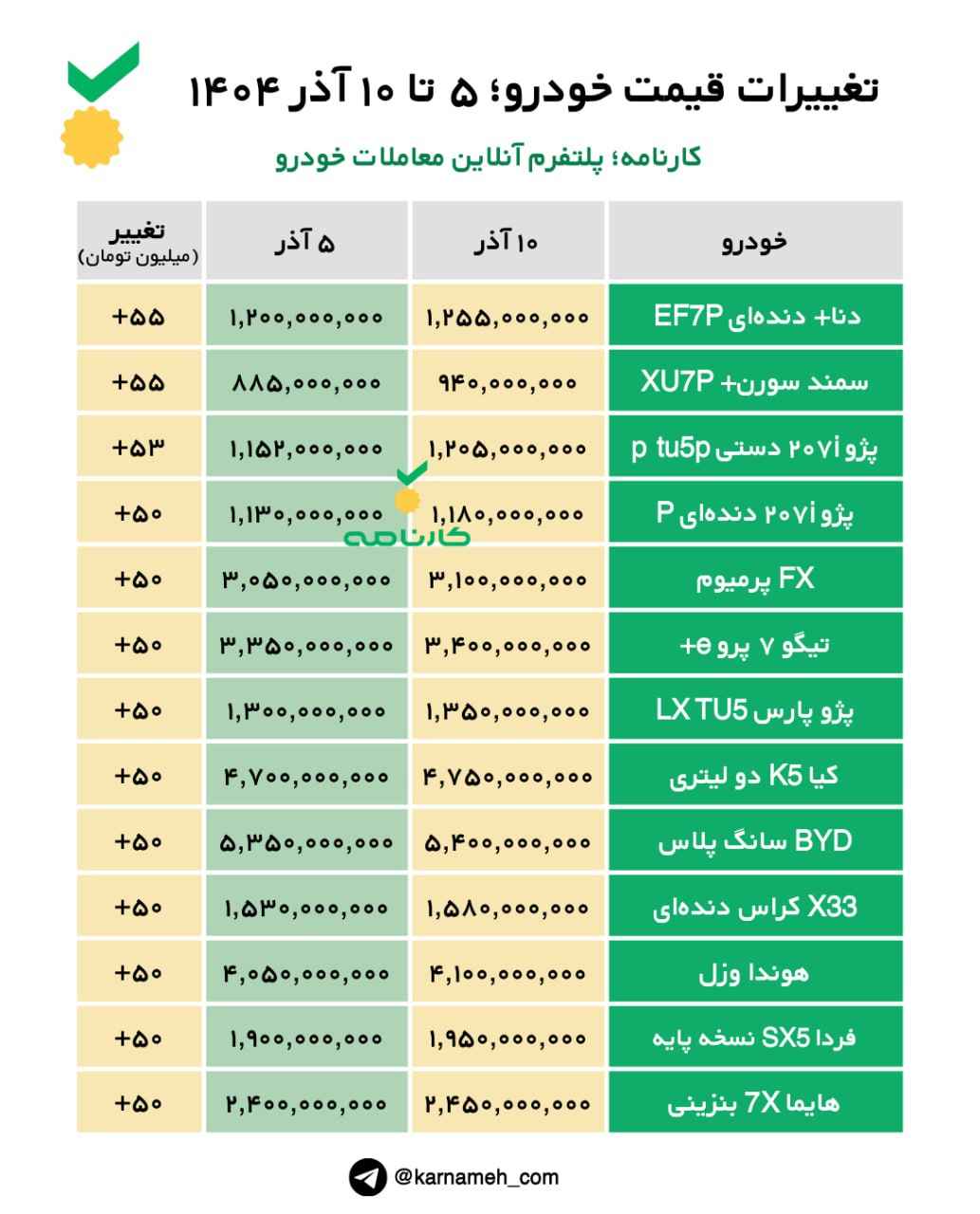 تغییرات قیمت خودرو؛ ۵ تا ۱۰ آذر ۱۴۰۴