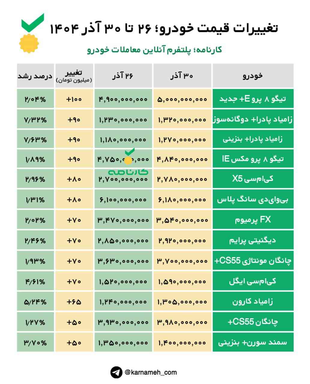 تغییرات قیمت خودرو؛ ۲۶ تا ۳۰ آذر ۱۴۰۴