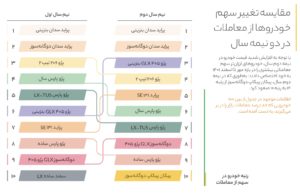 دامنه نوسان قیمت خودرو در دو نیمه سال متفاوت بود و این موضوع تأثیر خود را در بازار معاملات خودرو نشان داده است. براساس گزارش کارنامه وضعیت تغییر سهم خودروها از معاملات در نیمه اول و دوم سال ۱۴۰۱ به این شرح بوده است: