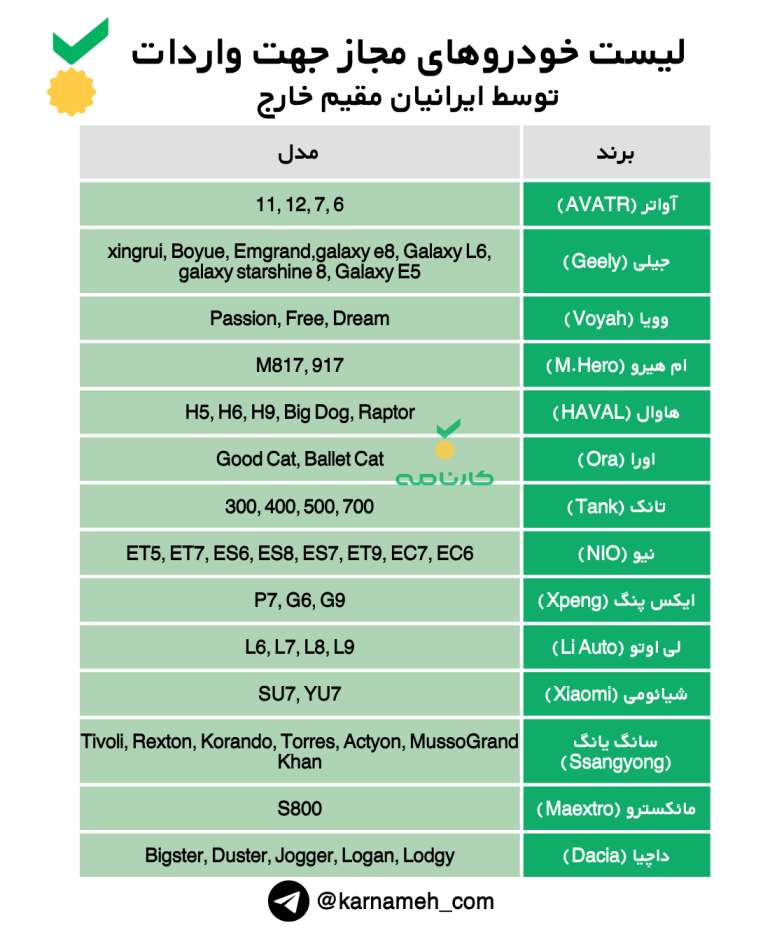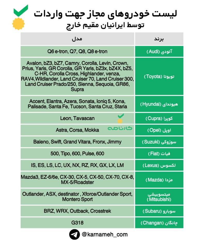 لیست خودروهای مجاز جهت واردات توسط ایرانیان مقیم خارج