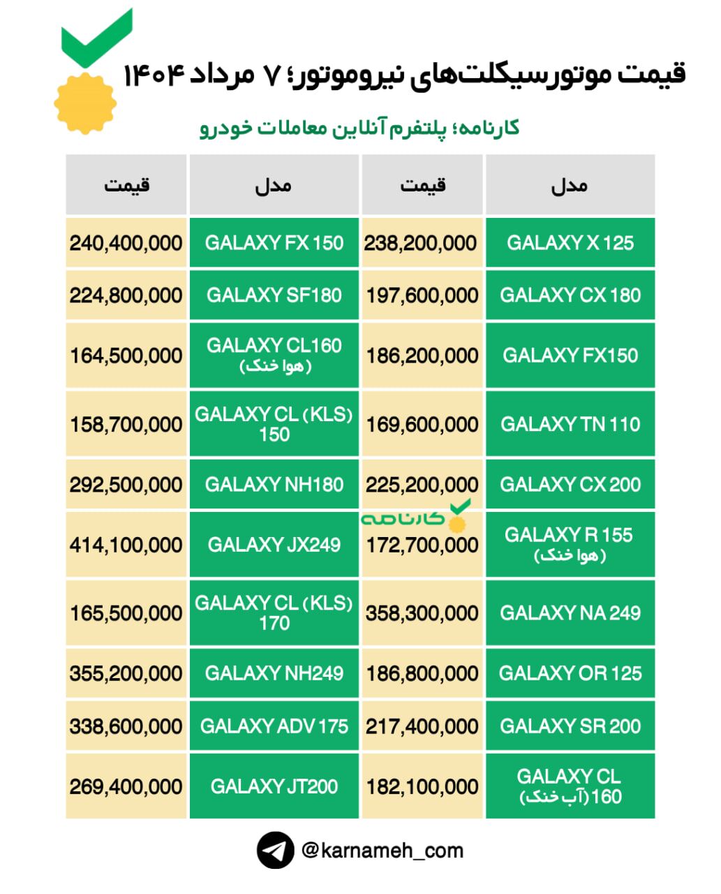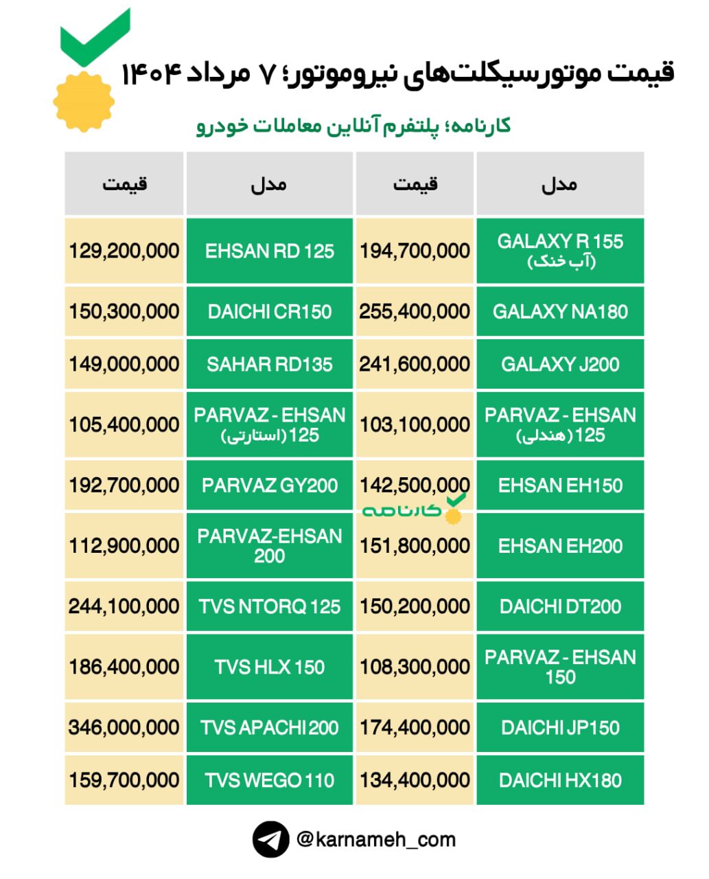 قیمت موتورسیکلتهای نیروموتور؛ ۷ مرداد ۱۴۰۴