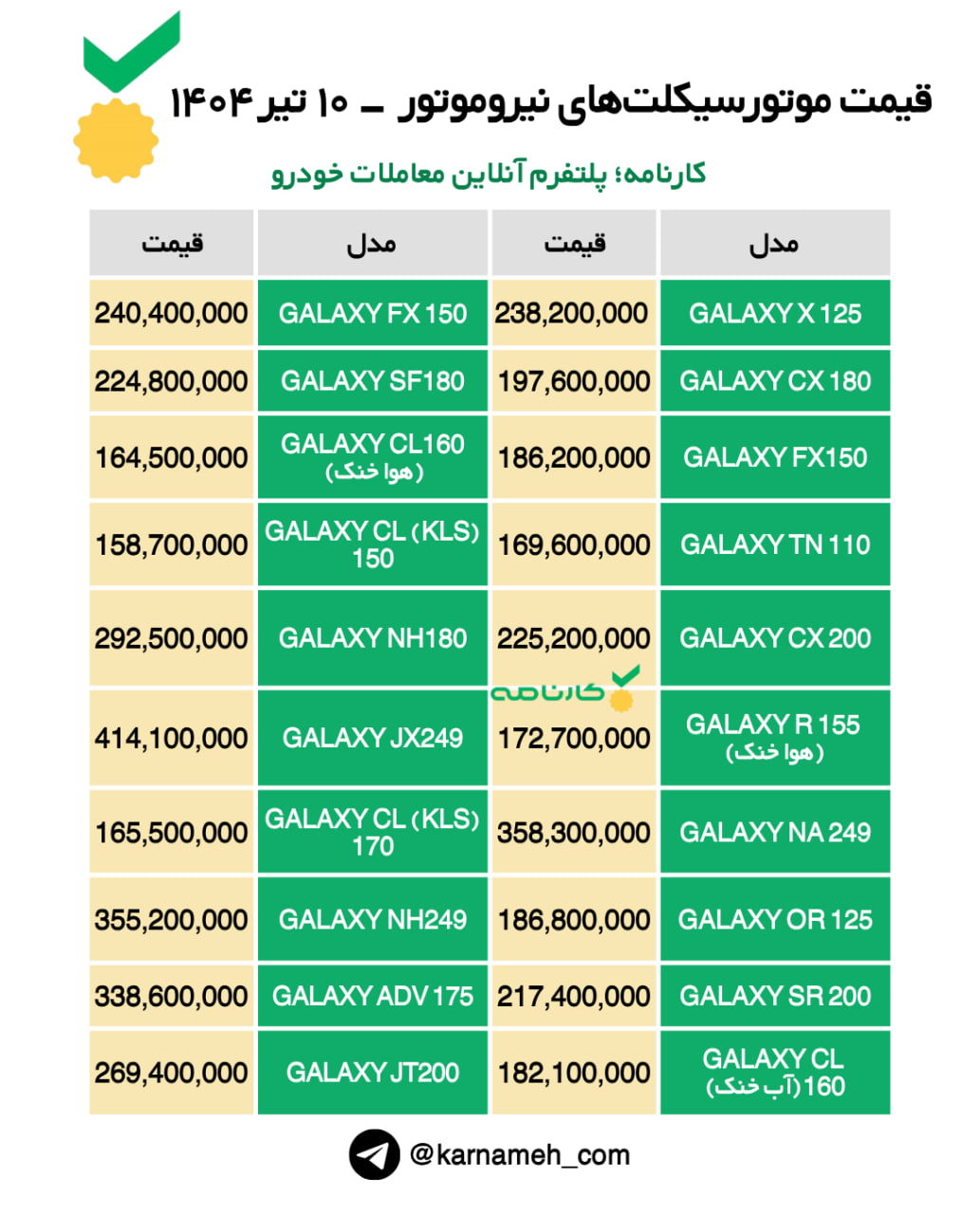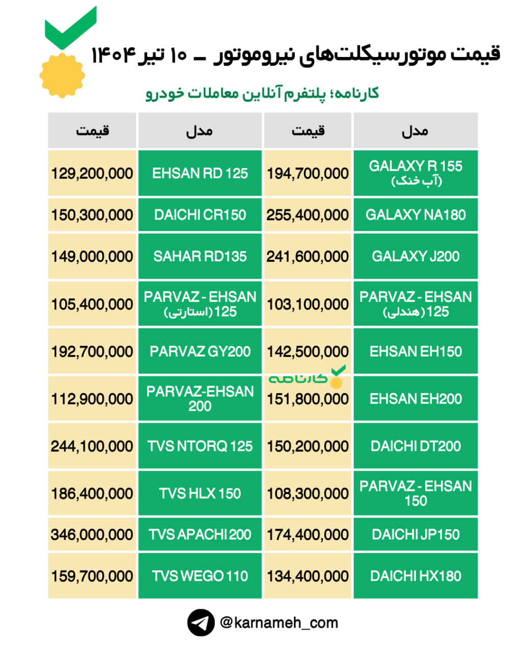 قیمت موتورسیکلتهای نیروموتور – ۱۰ تیر ۱۴۰۴
