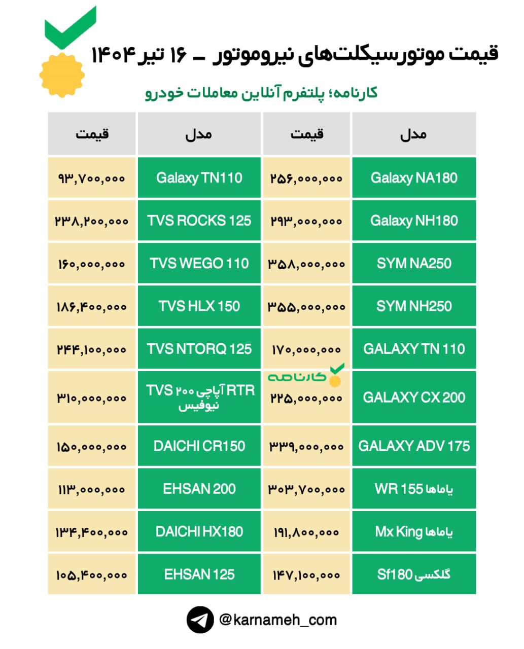قیمت موتورسیکلتهای نیروموتور – ۱۶ تیر ۱۴۰۴