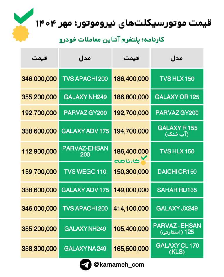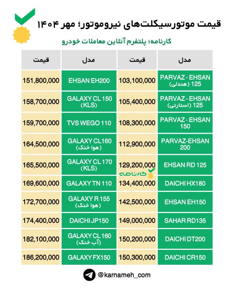 قیمت موتورسیکلتهای نیروموتور – مهر ۱۴۰۴