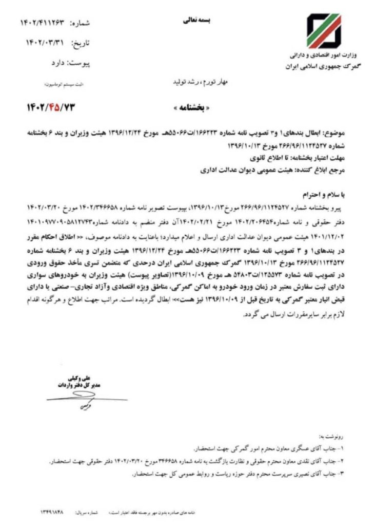 بر اساس اعلام دفتر واردات گمرک، بخشنامه ممنوعیت واردات خودروهای بالای ۴۰ هزار دلار به مناطق آزاد و ویژه اقتصادی برای خودروهای واردشده قبل از دیماه ۹۶ با حکم دیوان عدالت اداری باطل شد.