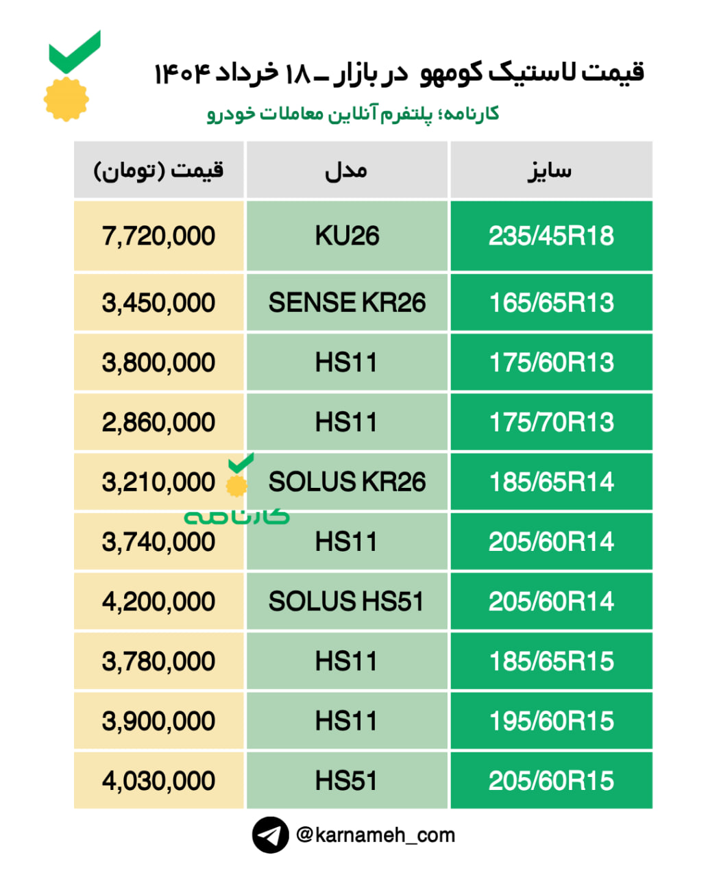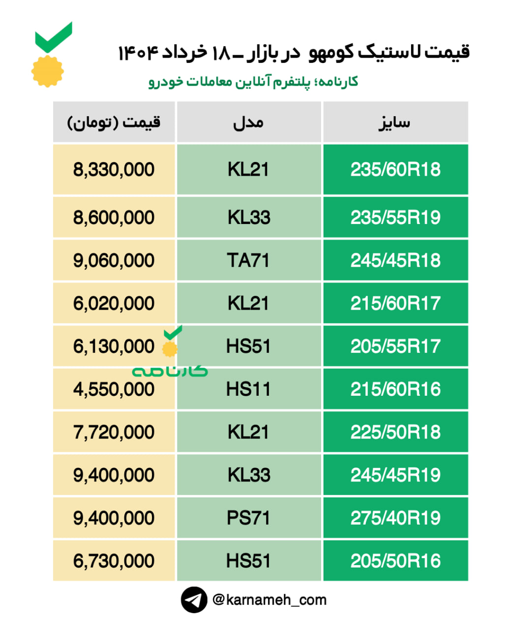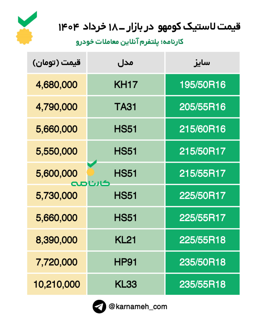 قیمت لاستیک کومهو در بازار ویژه ۱۸ خرداد ۱۴۰۴