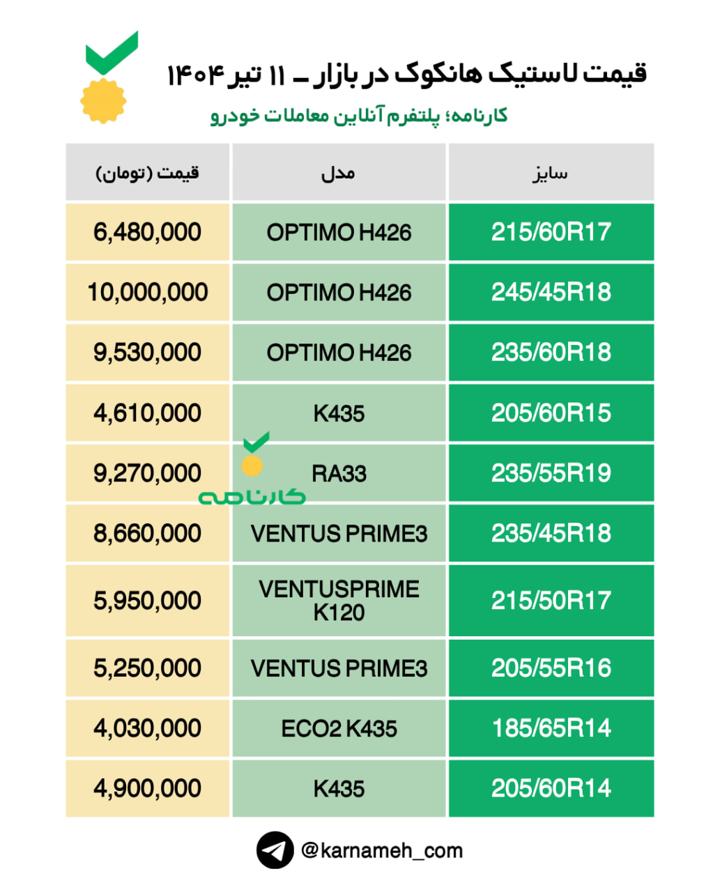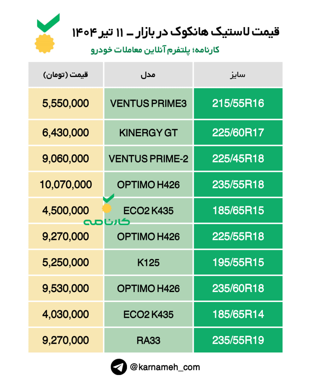 🔺قیمت لاستیک هانکوک در بازار – ۱۱ تیر ۱۴۰۴