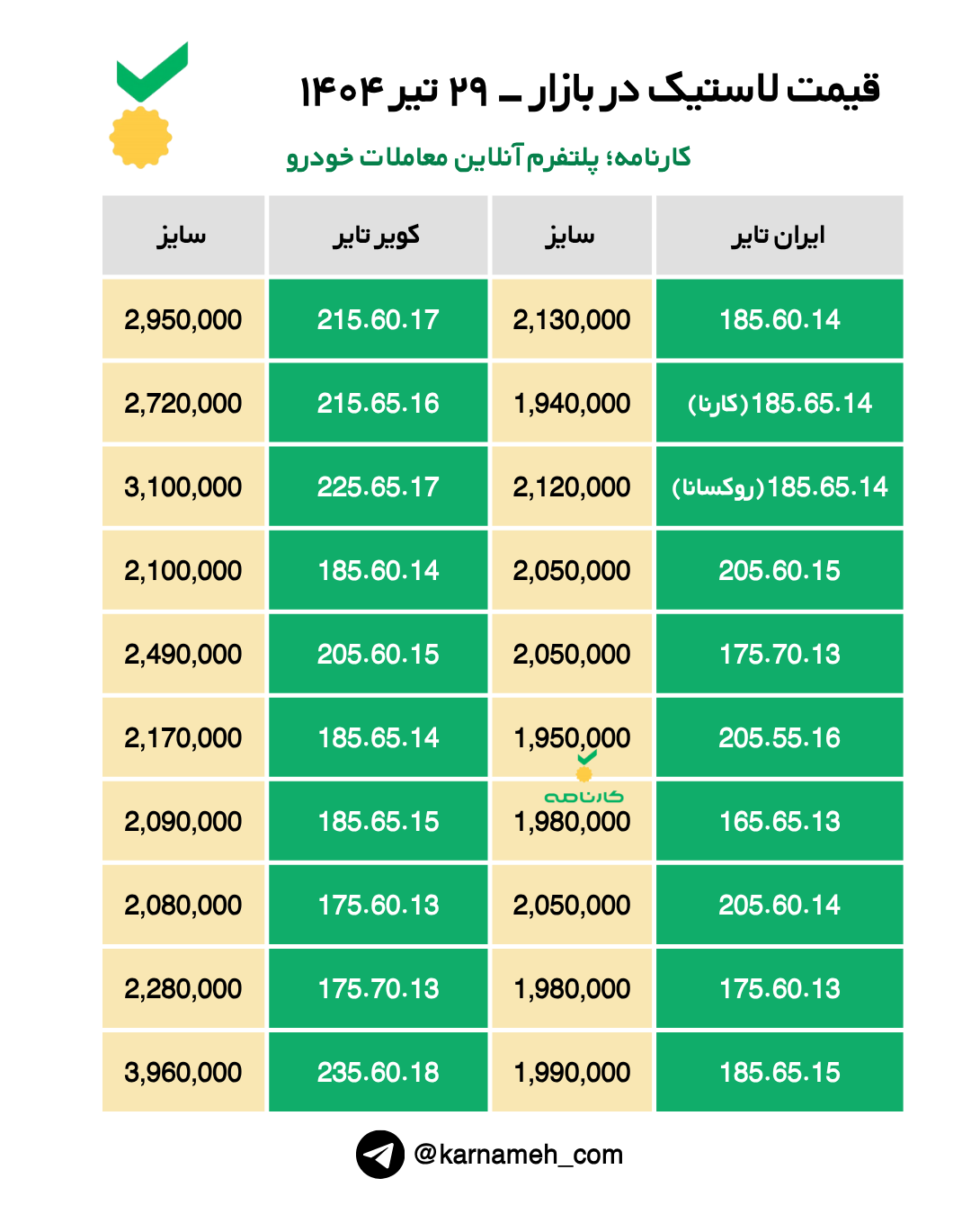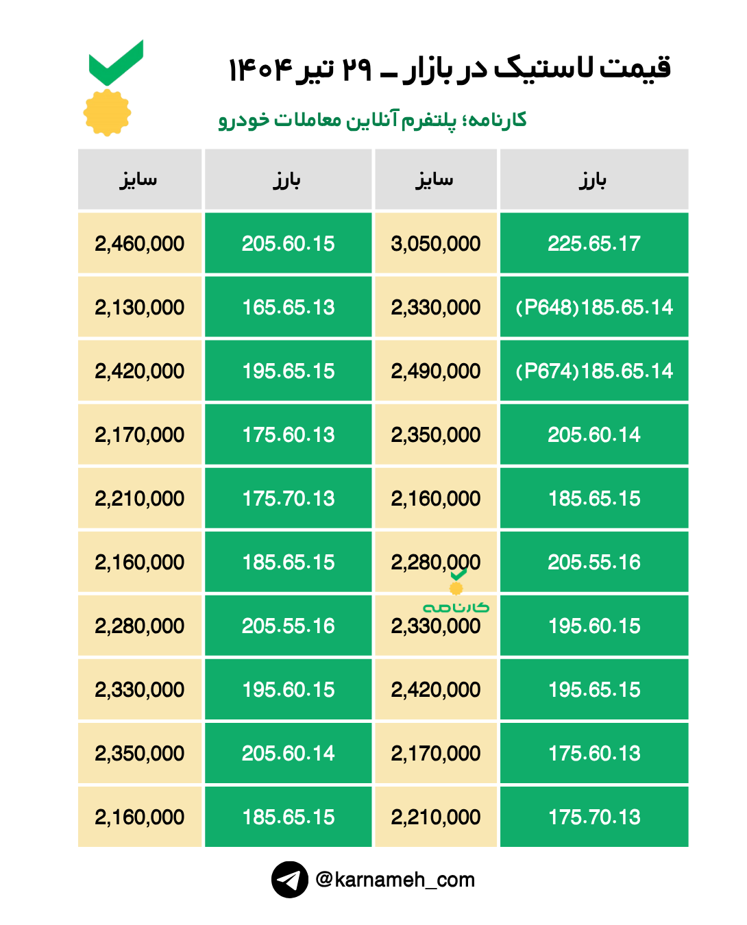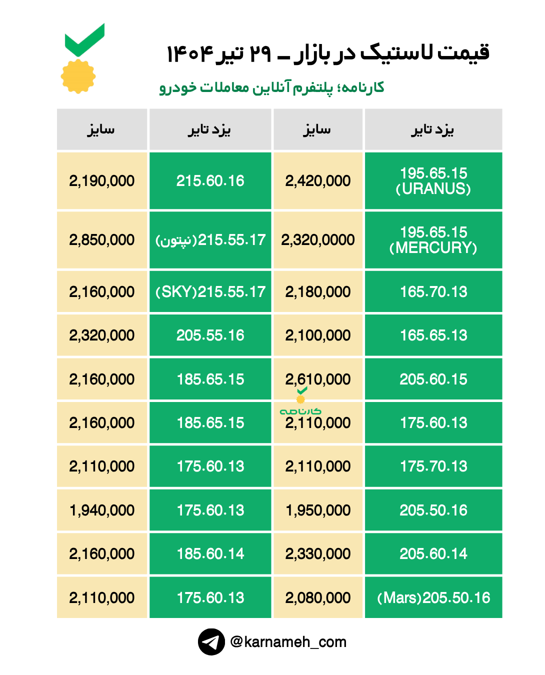 قیمت لاستیک در بازار – ۲۹ تیر ۱۴۰۴