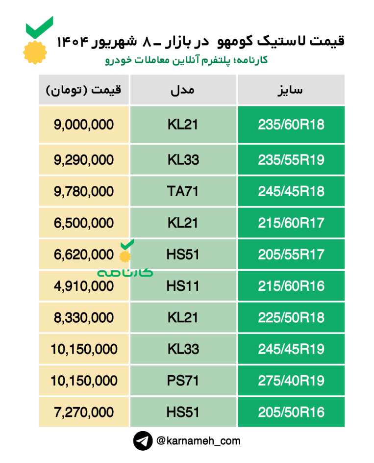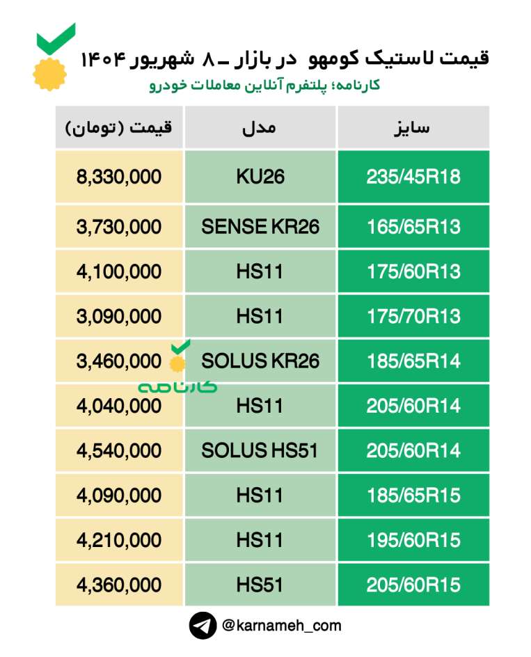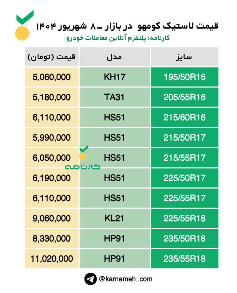 قیمت لاستیک کومهو در بازار -۸ شهریور ۱۴۰۴