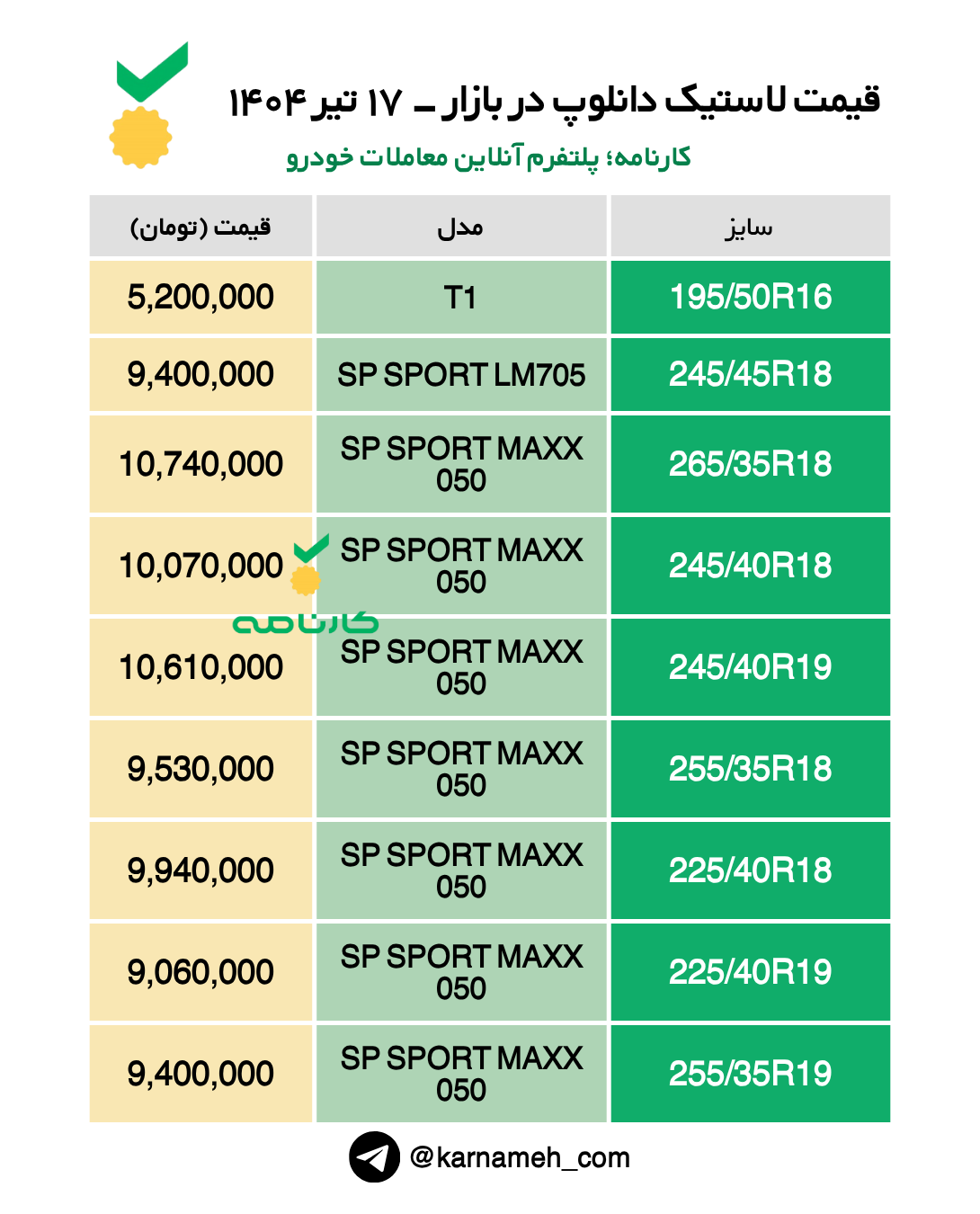 قیمت لاستیک دانلوپ در بازار – ۱۷ تیر ۱۴۰۴