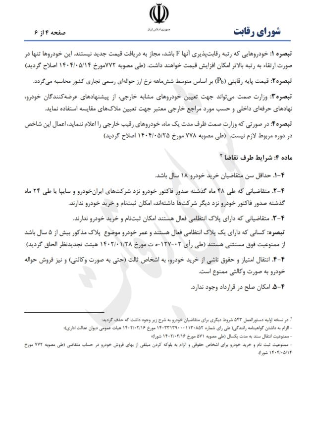 - مشتریانی که طی ۴۸ ماه گذشته فاکتور خودرویی از دو شرکت ایران خودرو و سایپا برای آنها صادر شد و افرادی که در ۲۴ ماه گذشته از دیگر شرکتها خرید داشتهاند مجاز به ثبتنام جدید نیستند.