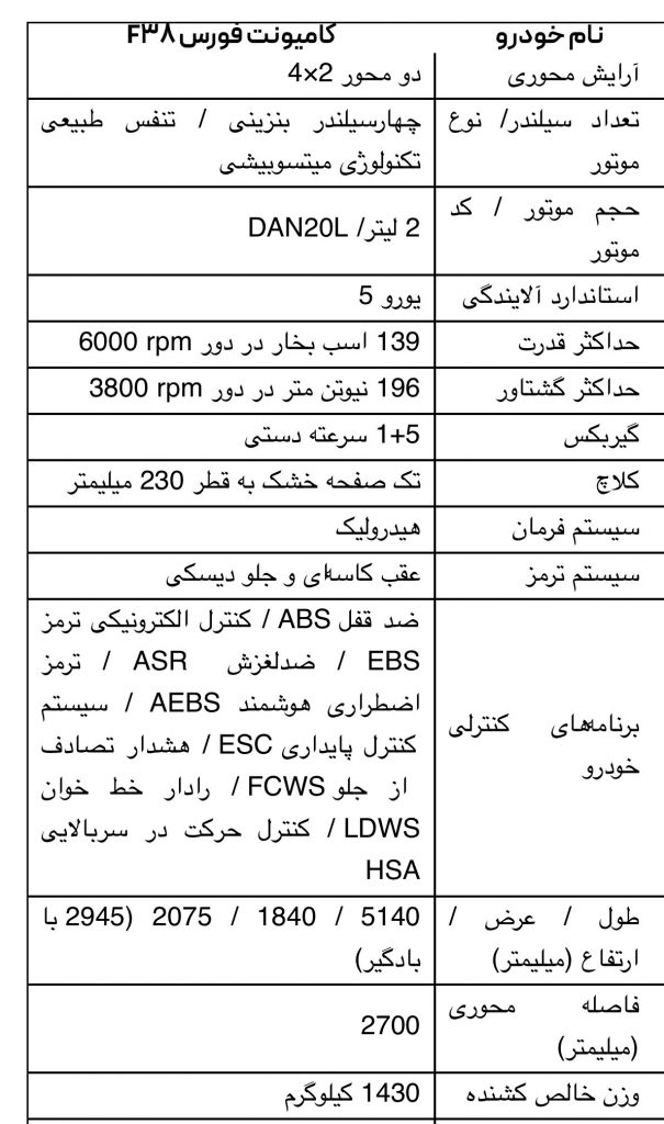 به گزارش کارنامه، این کامیونت در رده کامیونتهای سبک قرار میگیرد و توانایی حمل حدود ۲.۵ تن بار را دارد. طراحی ویژه فضای بار و حذف پرتی در محیط بار، قابلیت حمل بار بیشتری را در اختیار کاربر قرار میدهد. صندلی قابل تنظیم، تهویه مطبوع و مولتیمدیا مزایای کامیونت F38 نسبت به نیسان زامیاد به شمار میروند. این کامیونت با بهرهمندی از سیستم کنترل پایداری الکترونیکی (ESC)، ویژگی جدیدی در پایداری و ایمنی خودروهای سبک کار و تجاری را ارائه میدهد.