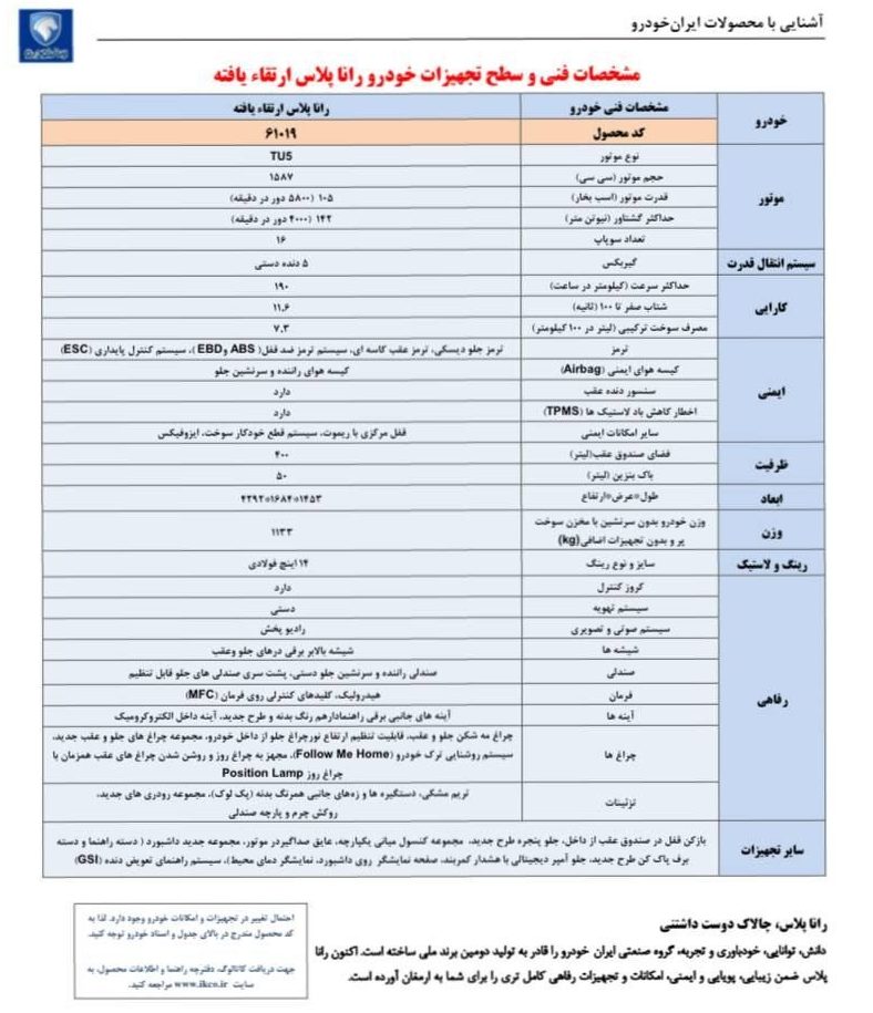 مشخصات فنی و امکانات رانا پلاس ارتقا یافته