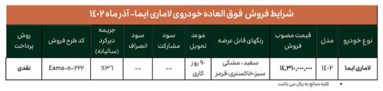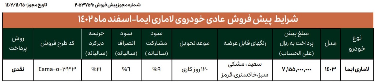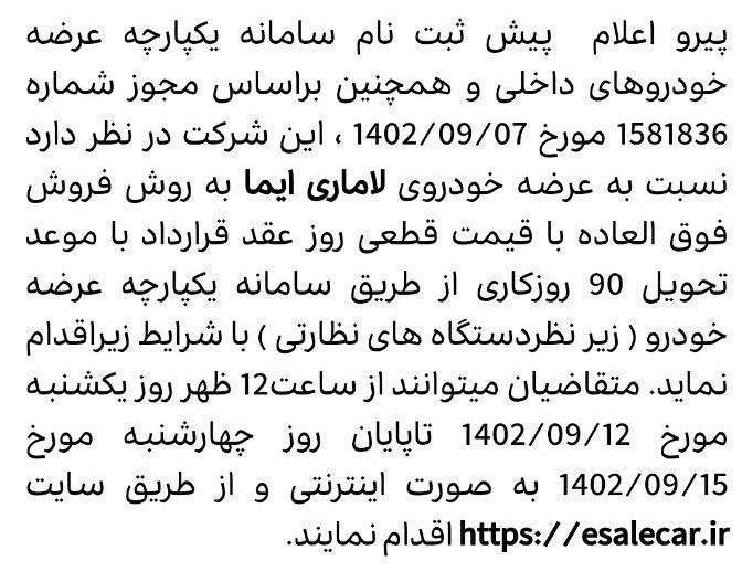 شرایط پیش فروش لاماری ایما ویژه متقاضیان مرحله دوم سامانه یکپارچه – اسفند ۱۴۰۲