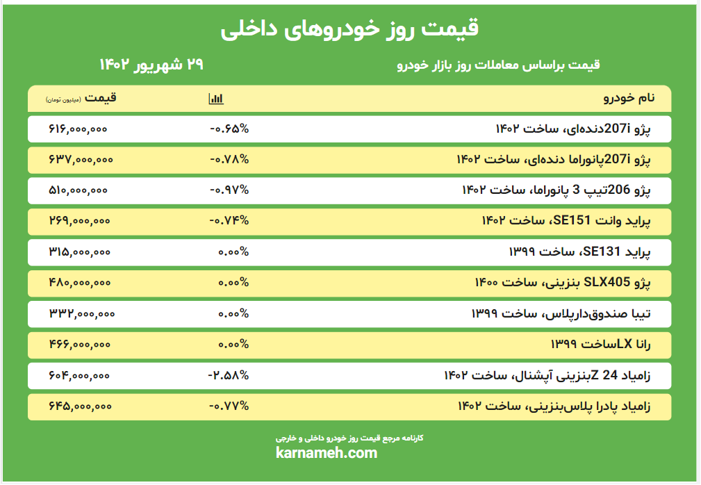 به گزارش کارنامه، لیست قیمت خودرو در روز چهارشنبه ۲۹ شهریور، نشانگر ادامه کاهش قیمت خودرو در میان خودروسازان داخلی است.