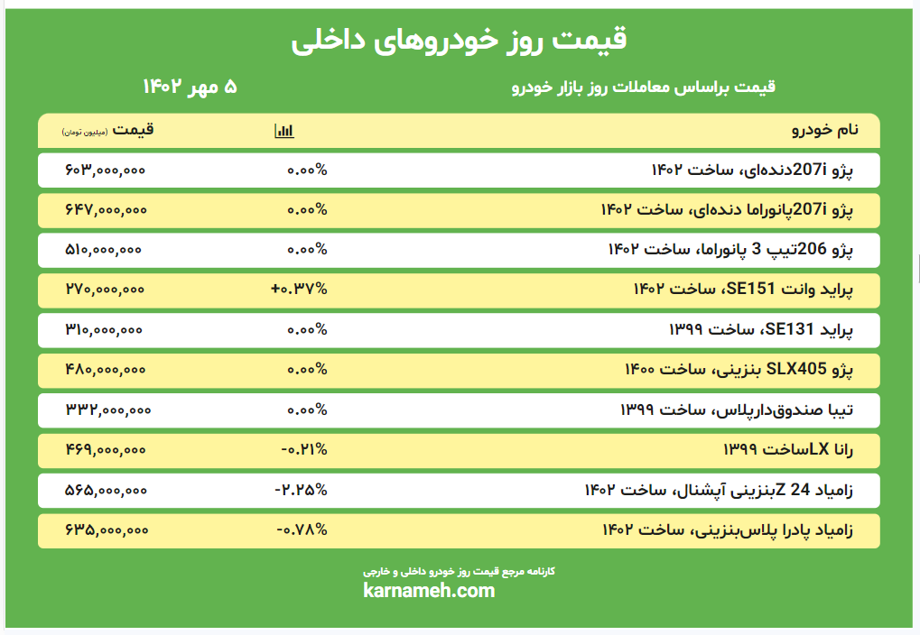 قیمت بازار خودرو امروز ۵ مهر ۱۴۰۲