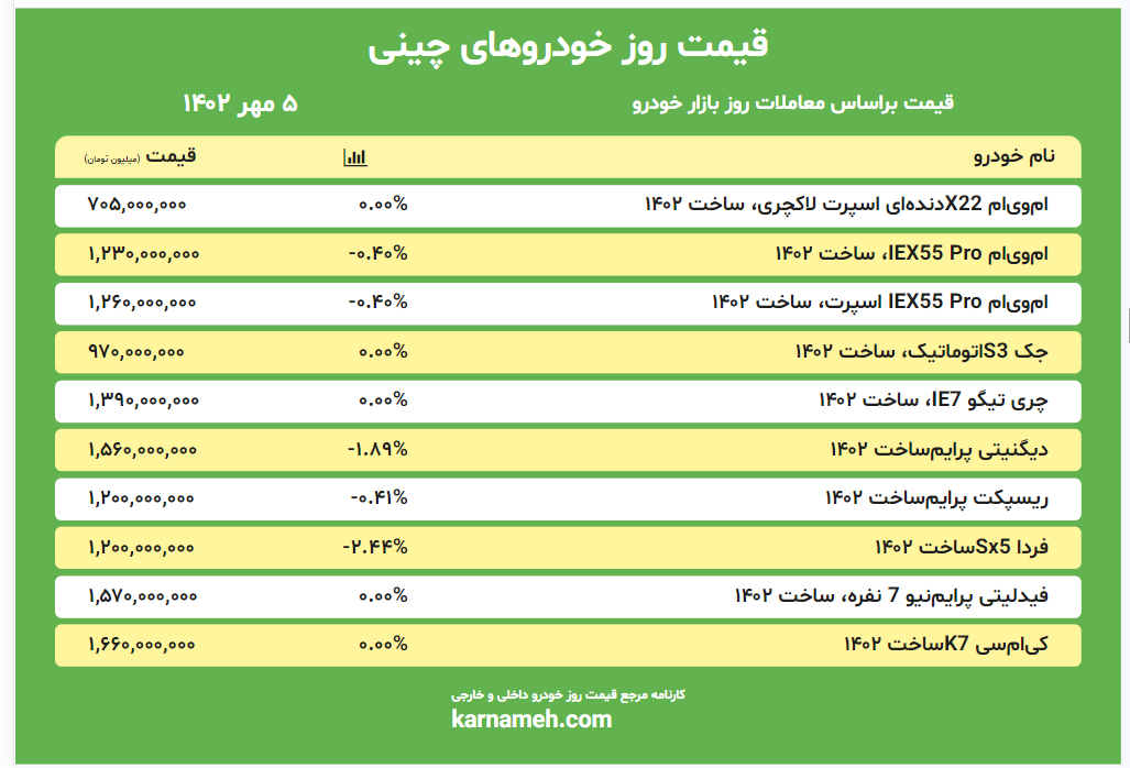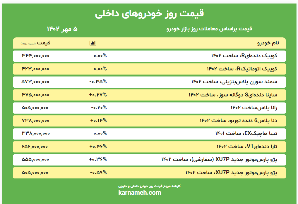لیست قیمت روز خودروهای داخلی و چینی در تاریخ ۵ مهر ۱۴۰۲ را مشاهده میکنید.