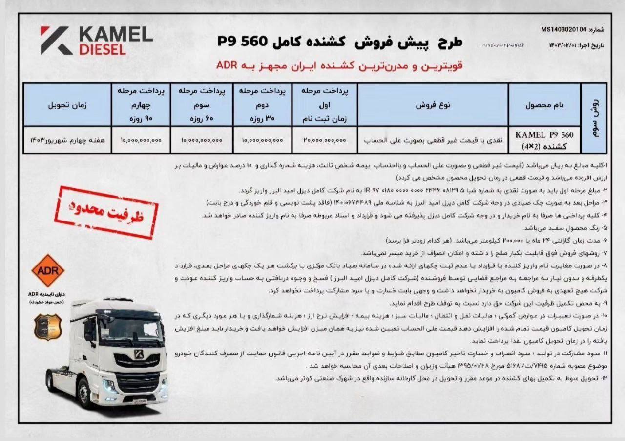 گروه صنعتی کامل دیزل در نخستین شرایط اعلامی برای کشنده P9، این محصول را با قیمت غیر قطعی و موعد تحویل شهریور ۱۴۰۳ پیش فروش میکند. متقاضیان میتوانند با مراجعه و تماس با شرکت کامل دیزل البرز نسبت به ثبتنام و واریز وجه اقدام نمایند: