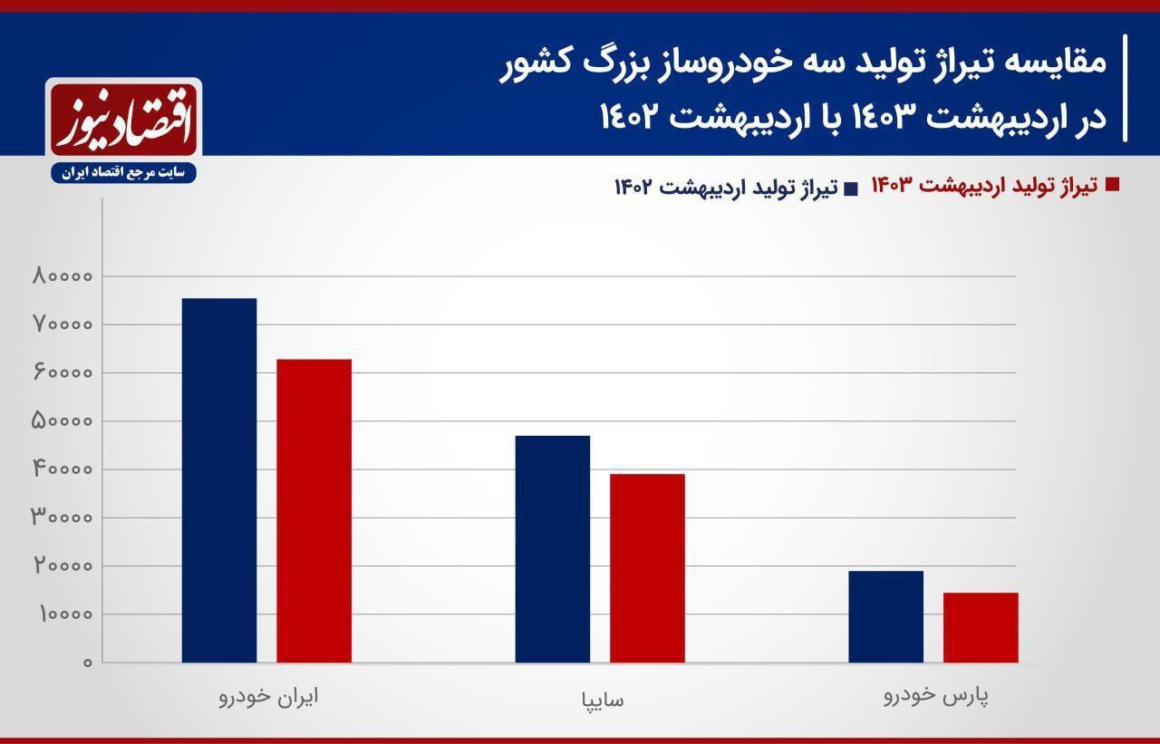 نمودار فوق وضعیت تولید را در سه خودروسازی ایران خودرو و سایپا گزارش میدهد؛ پارس خودرو نیز به عنوان زیر مجموعه گروه خودروسازی سایپا به صورت مستقل نمایش داده است. هر سه تولید کننده در اردیبهشت ۱۴۰۳ در مجموع ۱۷.۵ درصد افت تولید را پشت سر گذاشتند.