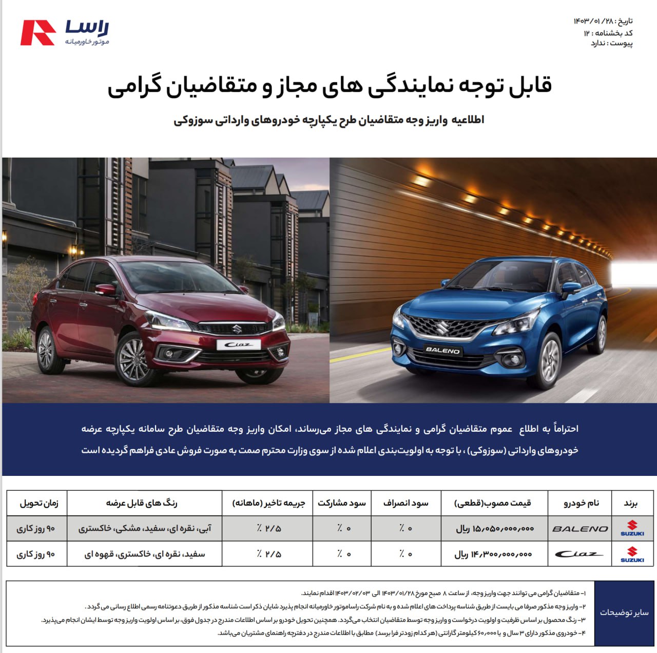 شرکت راسا موتور خاورمیانه نماینده سوزوکی ژاپن در ایران در جدیدترین شرایط فروش اعلامی ویژه سامانه یکپارچه خودروهای وارداتی، سدان اقتصادی سیاز و هاچ بک بالنو را عرضه میکند. متقاضیانی که نسبت به تعیین اولویت در سامانه اقدام نمودهاند میتوانند با مراجعه به نمایندگیها نسبت به تکمیل خرید اقدام نمایند: