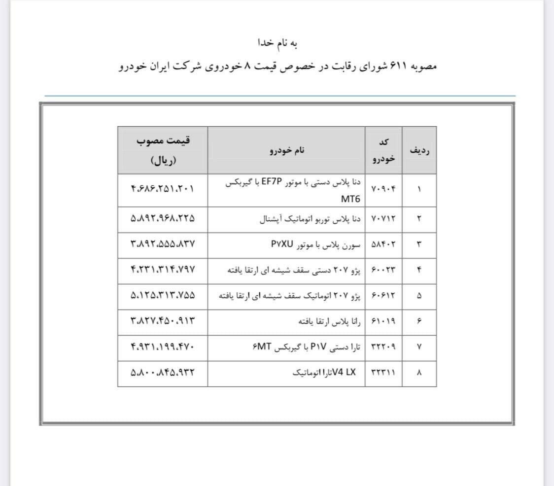 به گزارش کارنامه، شورای رقابت در جلسه روز گذشته خود (سهشنبه ۲۵ مهر ماه) بر اساس مصوبه ۶۱۱، قیمت هشت محصول ایران خودرو را که فاقد قیمت بودند را تعیین کرد.
