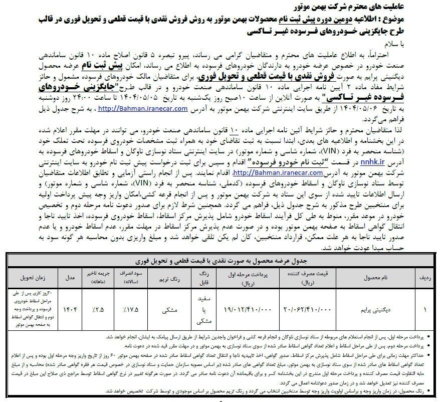 شرایط فروش محصولات بهمن موتور ویژه تمامی متقاضیان – مهر ۱۴۰۴