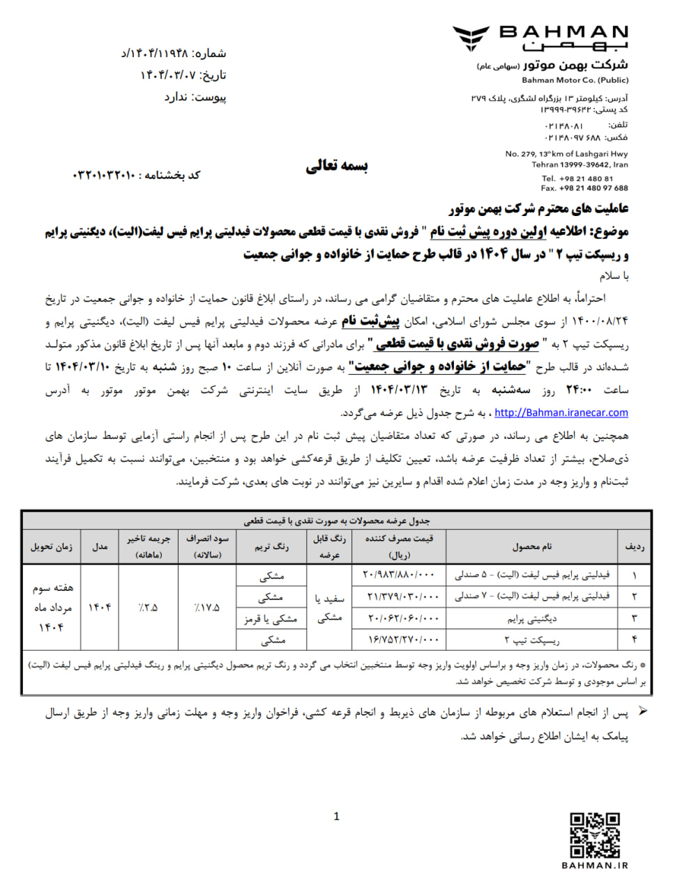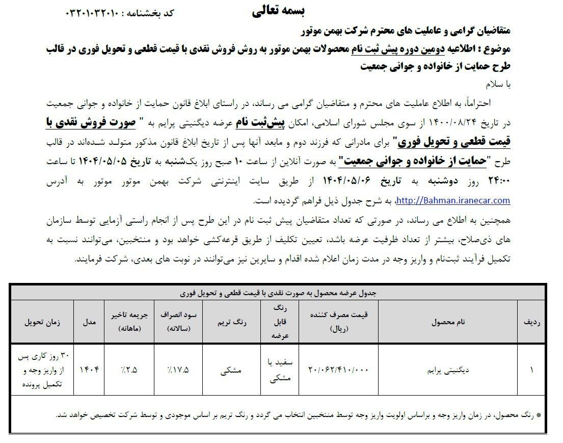 🔸امکان پیش ثبت نام عرضه دیگنیتی پرایم به صورت فروش نقدی با قیمت قطعی و تحویل فوری برای مادرانی که فرزند دوم و ما بعد آنها پس از تاریخ ابلاغ قانون مذکور متولد شده اند در قالب طرح حمایت از خانواده و جوانی جمعیت به صورت آنلاین از ساعت ۱۰ صبح روز یکشنبه به تاریخ ۱۴۰۴/۰۵/۰۵ تا ساعت ۲۴:۰۰ روز دوشنبه به تاریخ ۱۴۰۴/۰۵/۰۶ از طریق سایت اینترنتی شرکت بهمن موتور انجام خواهد شد.