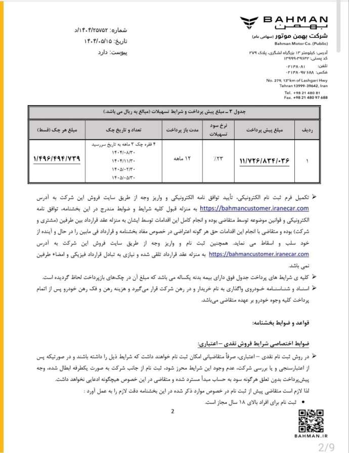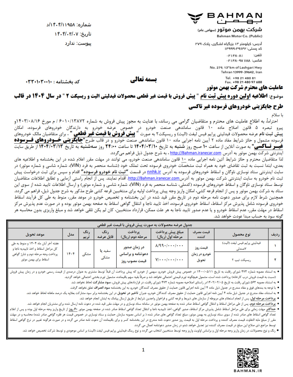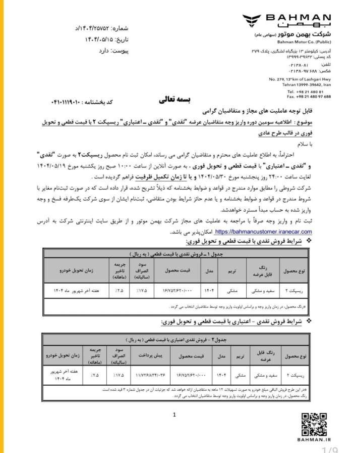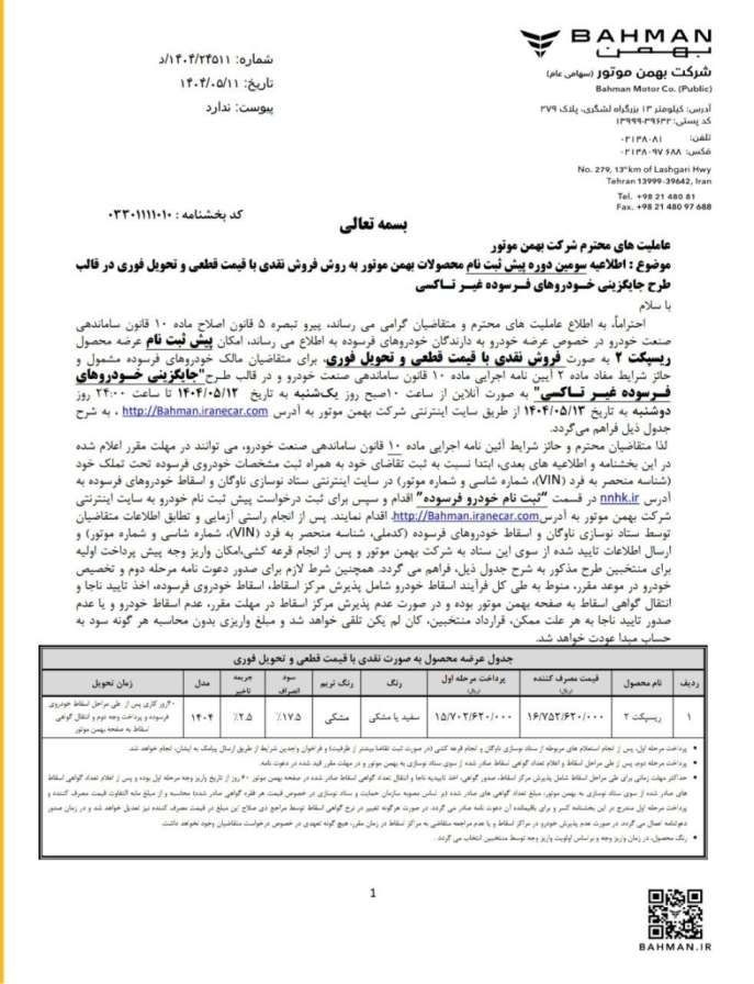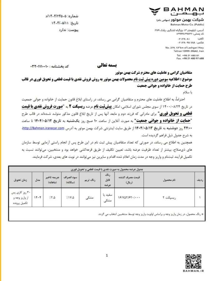 🔸بخشنامه جدید فروش اقساطی خودرو ریسپکت ۲ از تاریخ شنبه ۱۸ مردادماه ۱۴۰۴ در نمایندگیهای شرکت بهمن موتور آغاز خواهد شد.