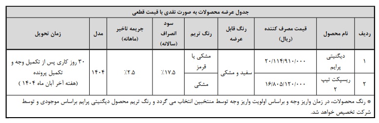 🔸امکان ثبت نام و واریز وجه برای محصول دیگنیتی پرایم به صورت نقدی با قیمت قطعی و تحویل فوری از ساعت ۱۰ صبح فردا دوشنبه مورخ ۶ مردادماه لغایت ساعت ۱۶ روز شنبه مورخ ۱۸ مردادماه ۱۴۰۴ یا تا زمان تکمیل ظرفیت فراهم گردیده است.