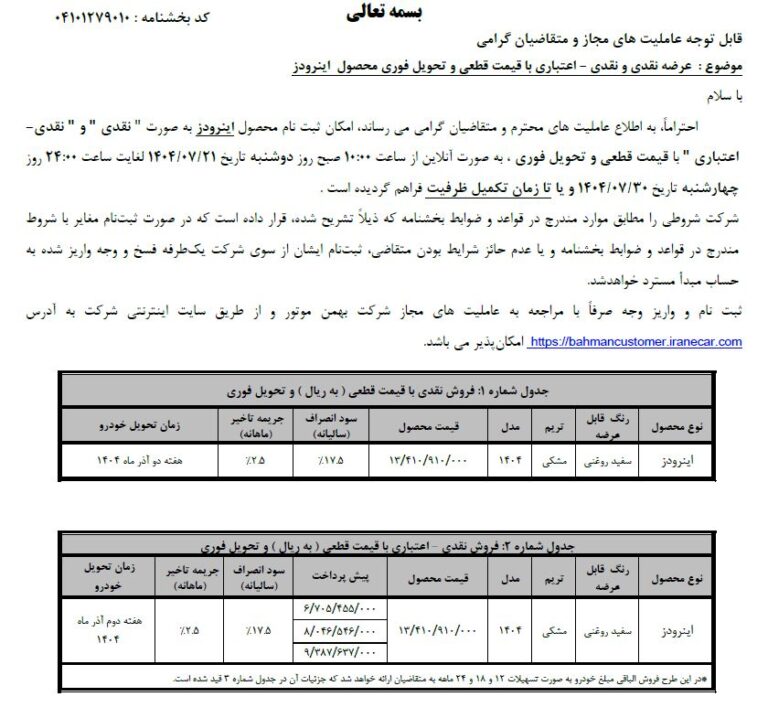 🔸بخشنامه فروش اقساطی محصولات بهمن موتور فعال شده و تا روز پنجشنبه ۳۰ مردادماه ۱۴۰۴ قابل اجرا است.