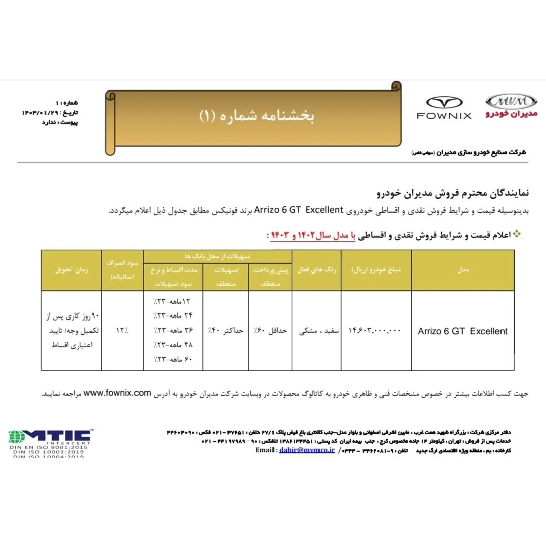 شرکت مدیران خودرو در جدیدترین شرایط فروش محصولات برند فونیکس، خودروهای آریزو ۶ GT و تیگو ۷ پریمیوم را به صورت نقدی و اقساطی از طریق نمایندگیهای خود عرضه میکند: