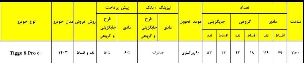 شرکت مدیران خودرو در جدیدترین شرایط فروش اعلامی، عرضه محصول تیگو ۸ پرو مکس IE را به صورت نقدی دو مرحلهای از ساعت ۱۰ تا ۱۱ روز دوشنبه ۱۸ فروردین ۱۴۰۴ مطابق شرایط زیر آغاز میکند:
