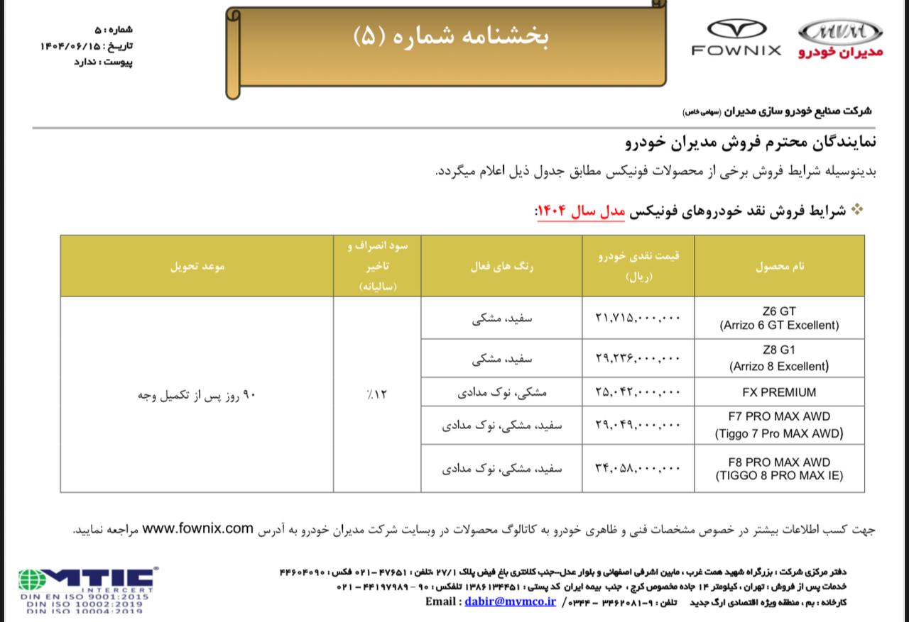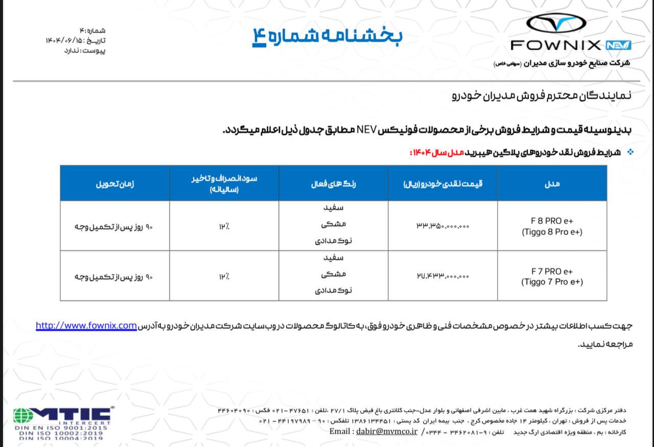 شرکت مدیران خودرو در جدیدترین شرایط فروش سهمیهای برای نمایندگیهای برند فونیکس، ۴ خودروی تیگو ۷ پرو پریمیوم، Fx پریمیموم و تیگو ۸ پرو مکس و e پلاس را به صورت نقدی و اقساطی بدون محدودیت از طریق نمایندگیهای خود عرضه میکند: