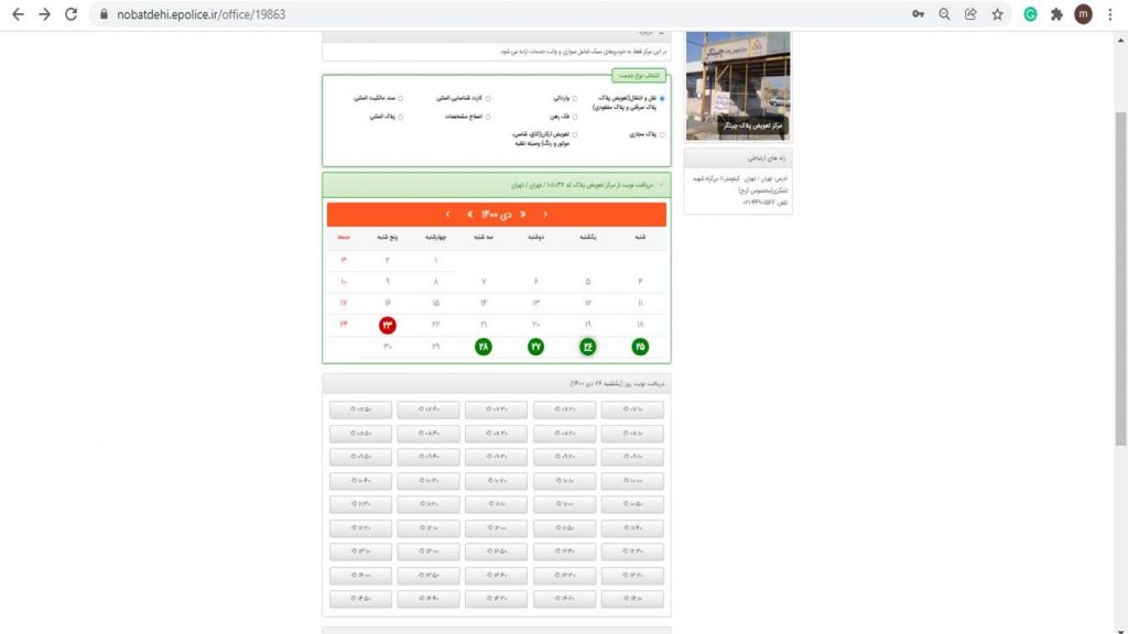 در مرحله بعد باید نوع خدمت، روز و تاریخ موردنظر خود و همچنین ساعت مراجعه را انتخاب کنید.