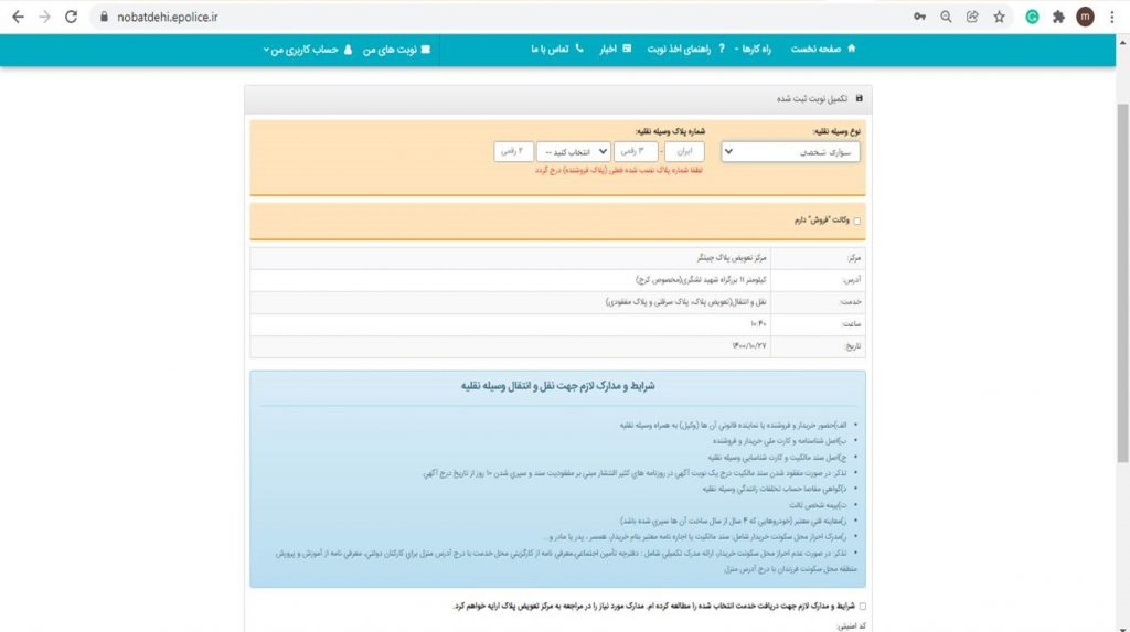 بعد از انتخاب تاریخ و زمان مراجعه، به مرحله آخر دریافت نوبت تعویض پلاک میرسید. در این بخش باید نوع وسیله نقلیه و شماره پلاک فعلی آن را وارد کنید. در صورتی که وکالت فروش نیز دارید، باید تیک آن بخش را هم بزنید.