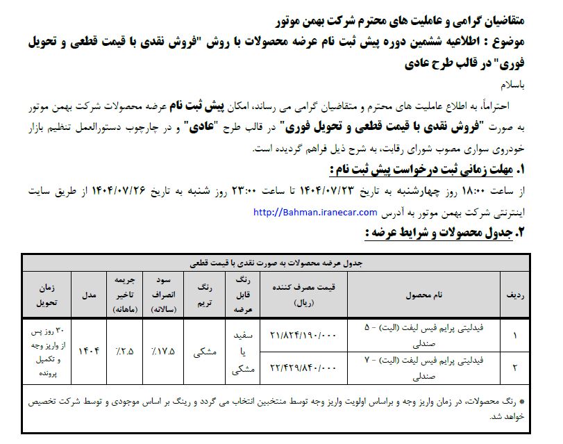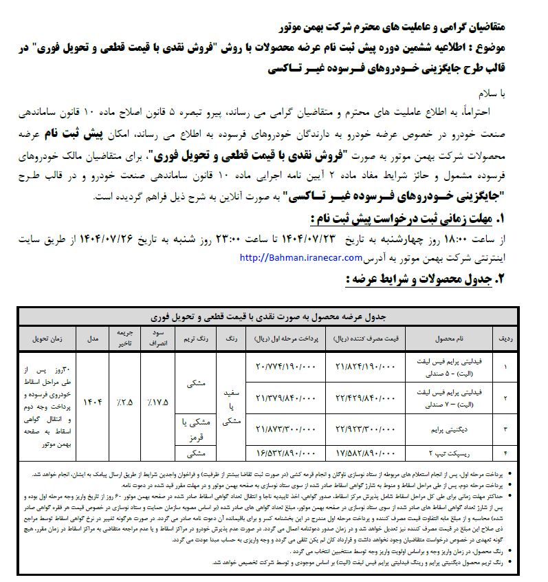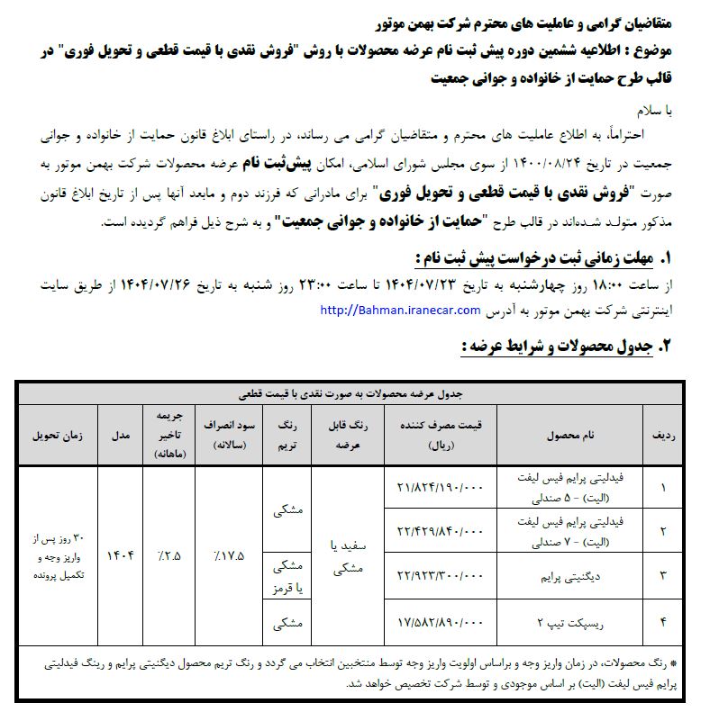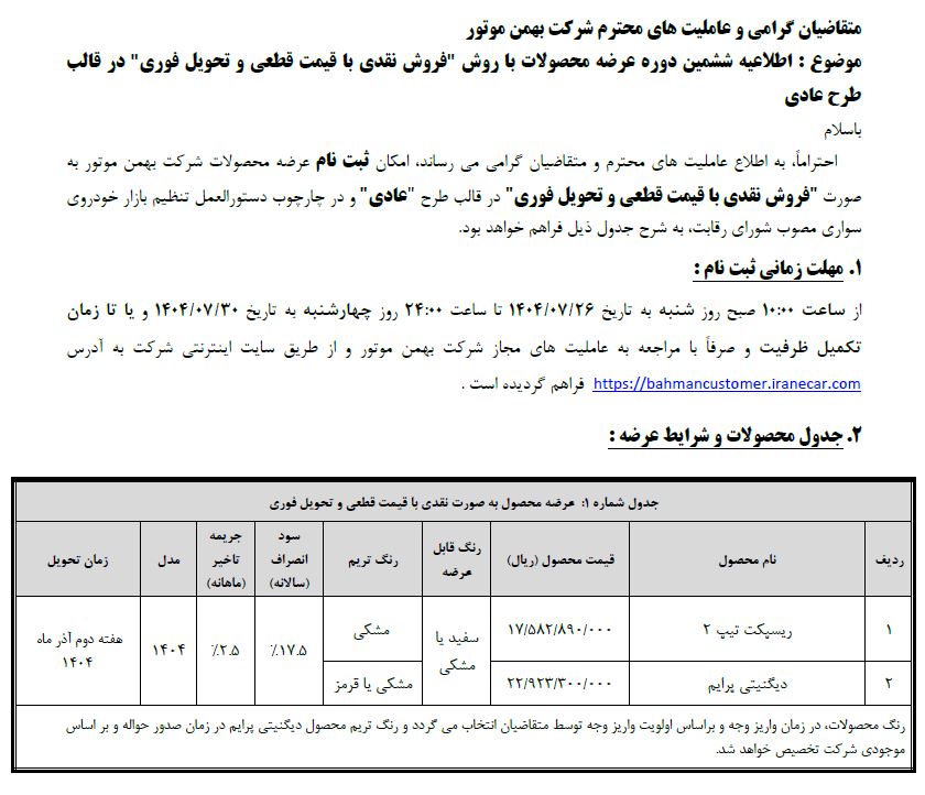 شرایط فروش ریسپکت بهمن موتور ویژه تمامی متقاضیان – مهر ۱۴۰۴