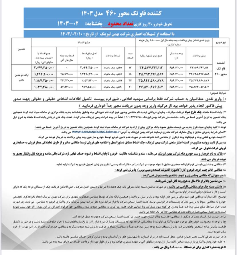 شرایط فروش اقساطی (لیزینگی) کشنده فاو ۴۶۰ بهمن دیزل – اردیبهشت ۱۴۰۳