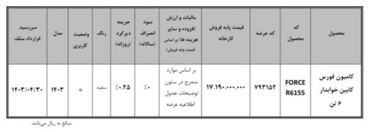 شرکت بهمن دیزل در بخشنامه جدید خود کامیونت فورس ۶ تن خوابدار را به صورت اقساطی با موعد تحویل فوری عرضه میکند. متقاضیان خرید این خودرو میتوانند با مراجعه به سامانه فروش محصولات بهمن دیزل به صورت آنلاین و یا خرید از طریق نمایندگیهای مجاز بهمن دیزل نسبت به خرید اقدام نمایند: