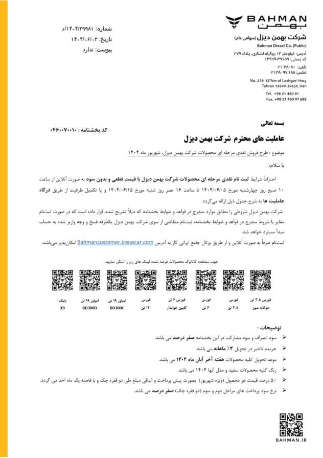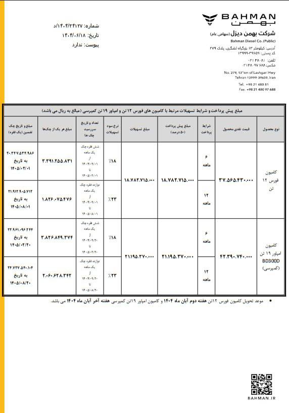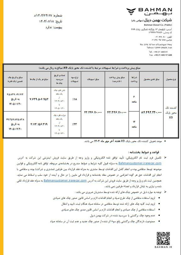 شرایط فروش اقساطی محصولات بهمن دیزل – مهر ۱۴۰۳