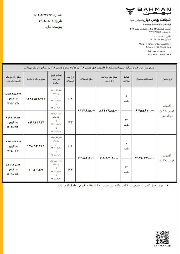 شرکت بهمن دیزل در بخشنامه جدید خود کامیونت فورس ۳.۸ تن را به صورت اقساطی لیزینگی عرضه میکند. متقاضیان خرید این خودرو میتوانند با مراجعه به سامانه فروش محصولات بهمن دیزل به صورت آنلاین و یا خرید از طریق نمایندگیهای مجاز بهمن دیزل نسبت به خرید اقدام نمایند: