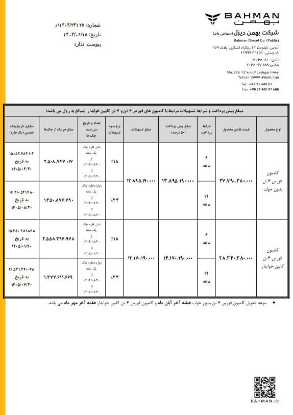 شرکت بهمن دیزل در بخشنامه جدید خود کامیون ۶ و ۱۲ تن فورس را به صورت اقساطی، دارای شروط ثبت نام و با امکان انتخاب کاربری مخصوص عرضه میکند. متقاضیان خرید این خودرو میتوانند با مراجعه به سامانه فروش محصولات بهمن دیزل به صورت آنلاین و یا خرید از طریق نمایندگیهای مجاز بهمن دیزل نسبت به خرید اقدام نمایند: