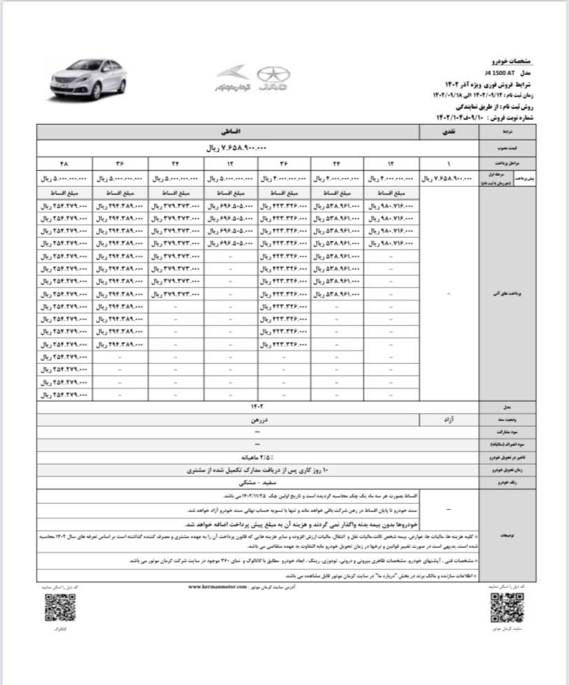 شرکت کرمان موتور جک J4 را به صورت نقدی و اقساطی با بازپرداخت حداکثر ۳۰ ماهه و موعد تحویل ۹۰ روز کاری عرضه میکند؛ مبلغ پیش پرداخت در این طرح فروش نسبت به برنامههای قبلی کاهش پیدا کرده است: