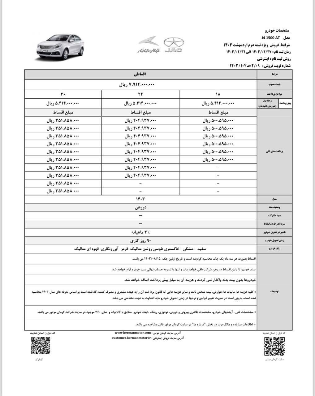 شرکت کرمان موتور جک J4 را به صورت نقدی و اقساطی حداکثر ۳۰ ماهه و با زمان تحویل ۹۰ روز کاری عرضه میکند: