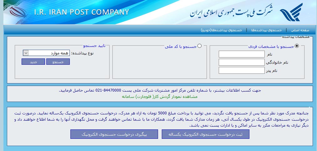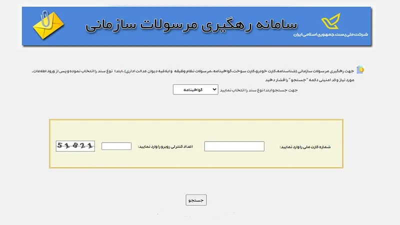 • جستجو: با کلیک بر روی دکمه جستجو، تمام جزئیات مربوط به مرسوله شما نمایش داده می‌شود. در صورتی که گواهی‌نامه شما هنوز ارسال نشده باشد با پیام ” مرسوله‌ای با مشخصات وارد شده تاکنون از سوی ناجا تحویل پست نگردیده است.” مواجه خواهید شد.