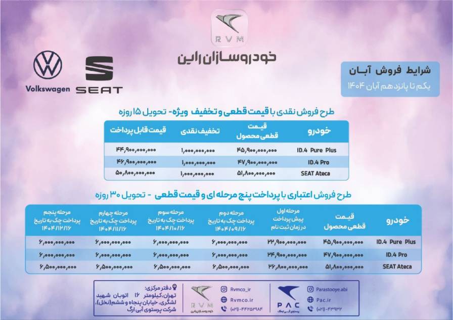 شرایط فروش فولکس واگن آی دی فور (ID.4) خودروسازان راین – مهر ۱۴۰۴